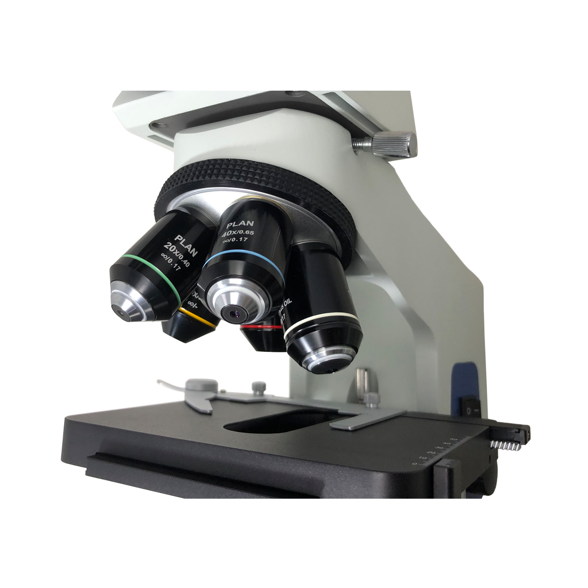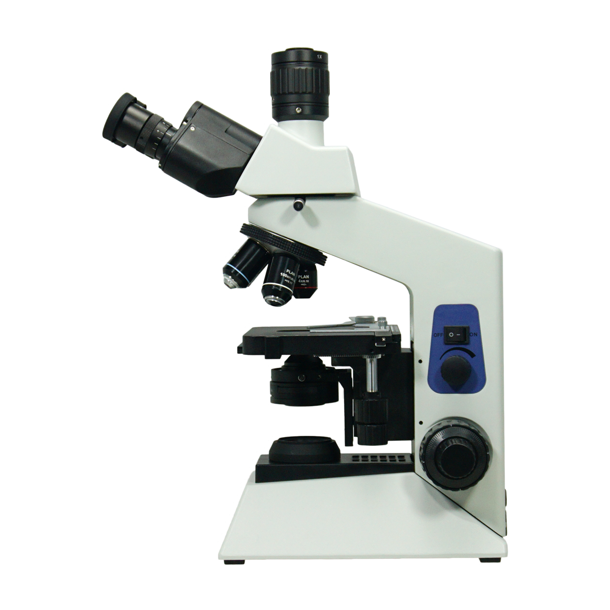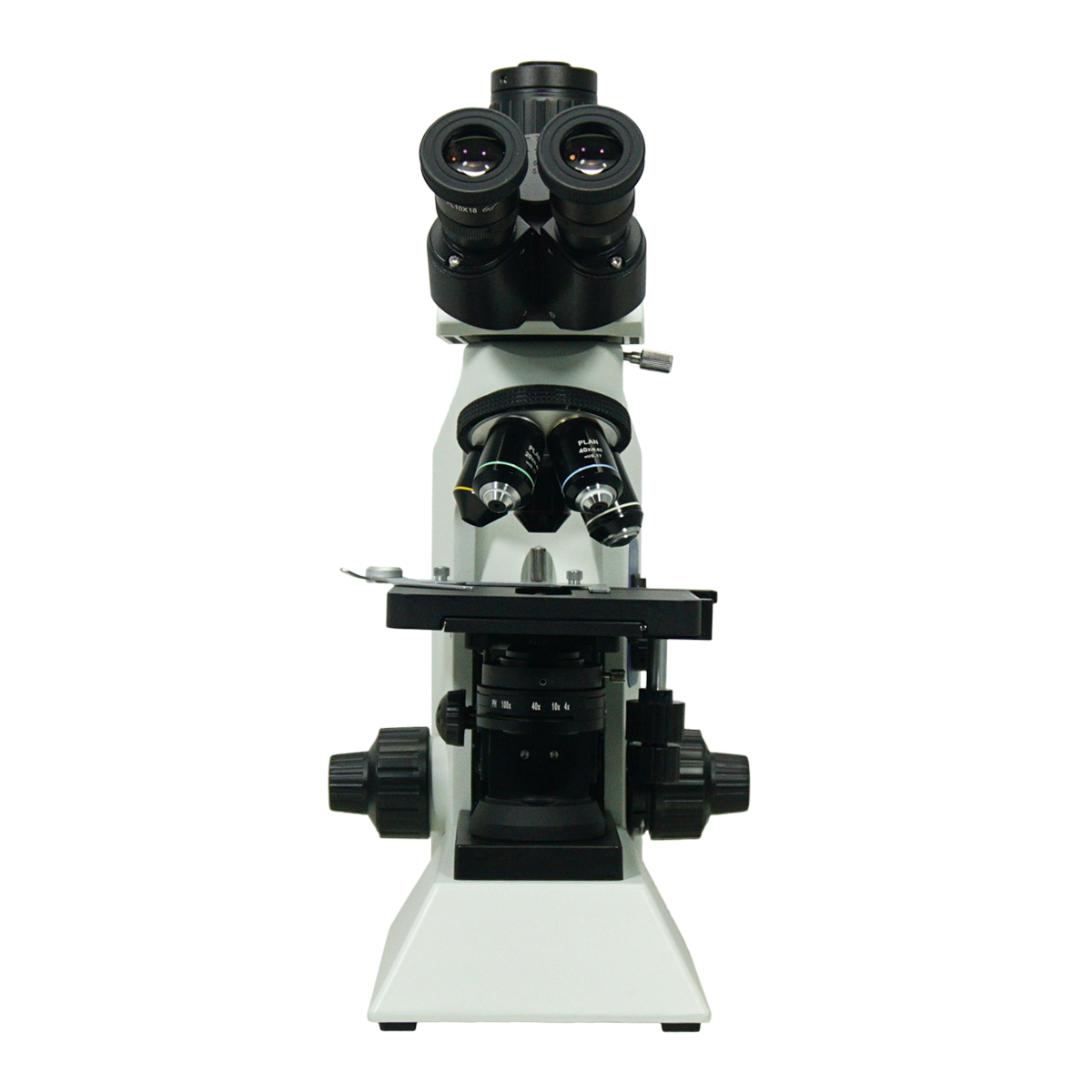 Infinite. Total Magnification: 40-1000X. 10X High Eyepoint Eyepiece. 4X 10X 20X 40X 100X Infinity Plan Achromatic Objective. Standard Coupler: 1X. Eye Tube Angle: 30°. Eyepiece Field of View: Dia. 18mm. XY Stage Travel Distance: 75x50mm. Illumination Type: Halogen Transmitted Light. Input Voltage: AC 100-240V 50/60Hz.