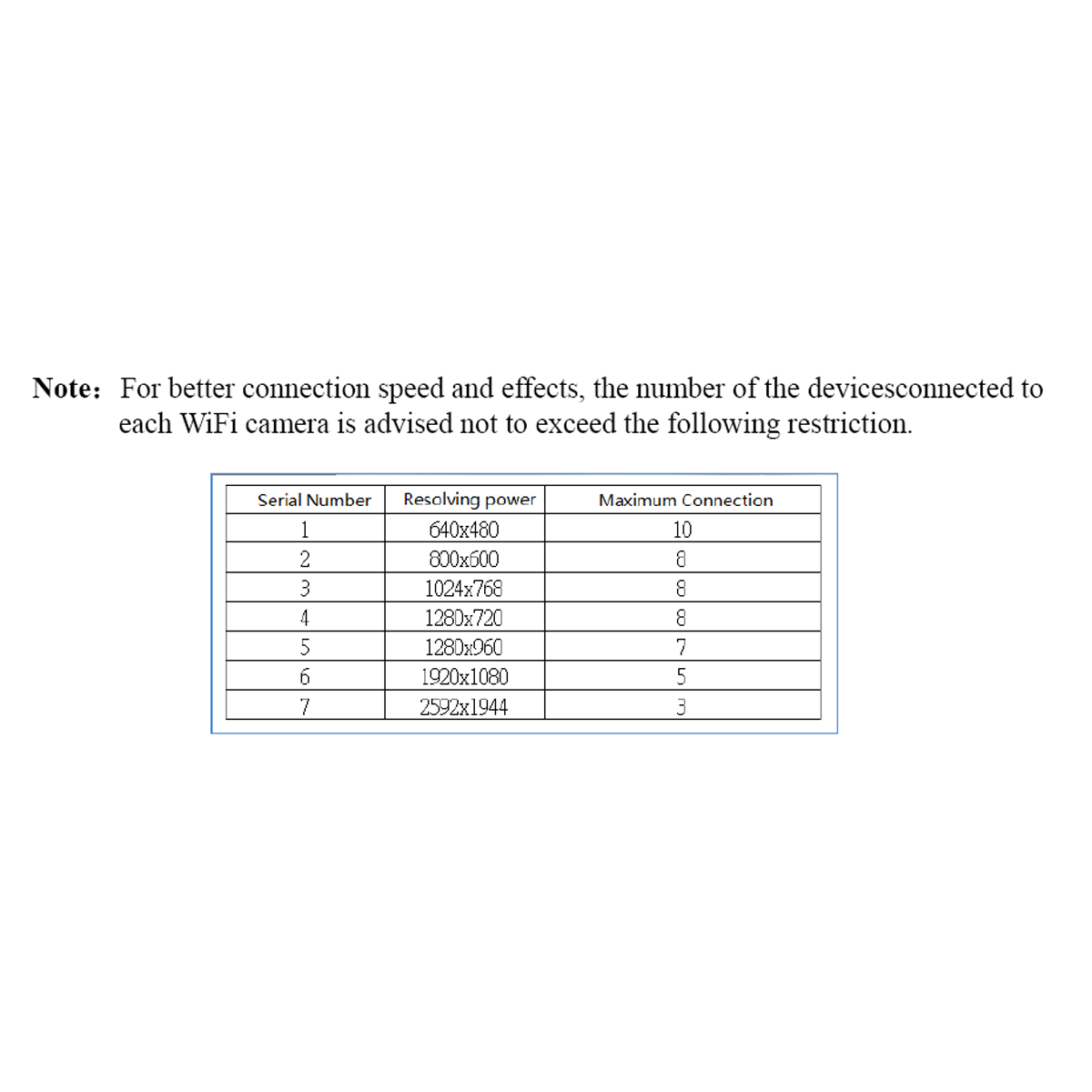 | Devices Connected At The Same Time | Wifi Connecting:10pc@640480, 8pc@800x600/1024x768/1280x720, 7pc@1280x960, 5pc@1920x1080, 3pc@2592x1944 |