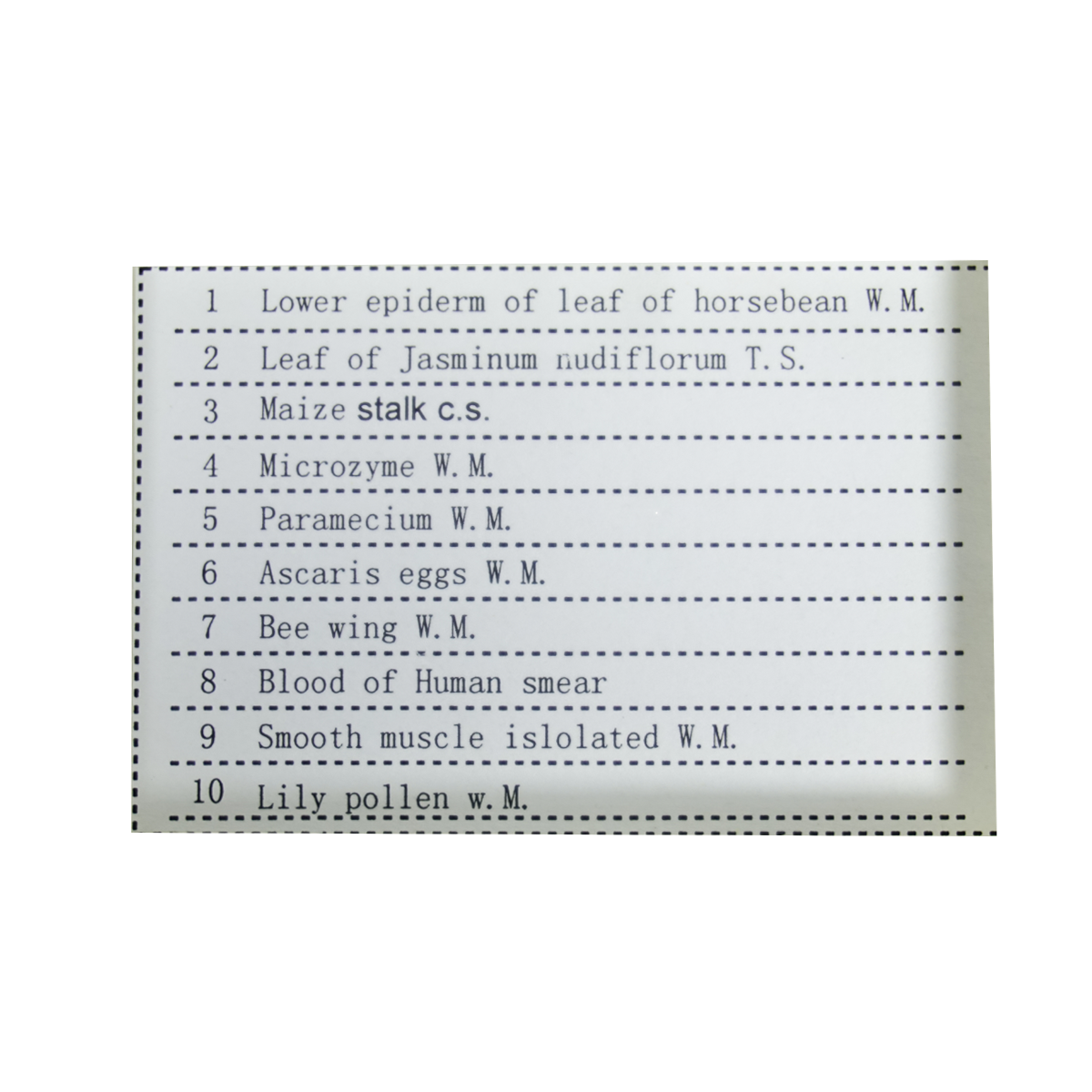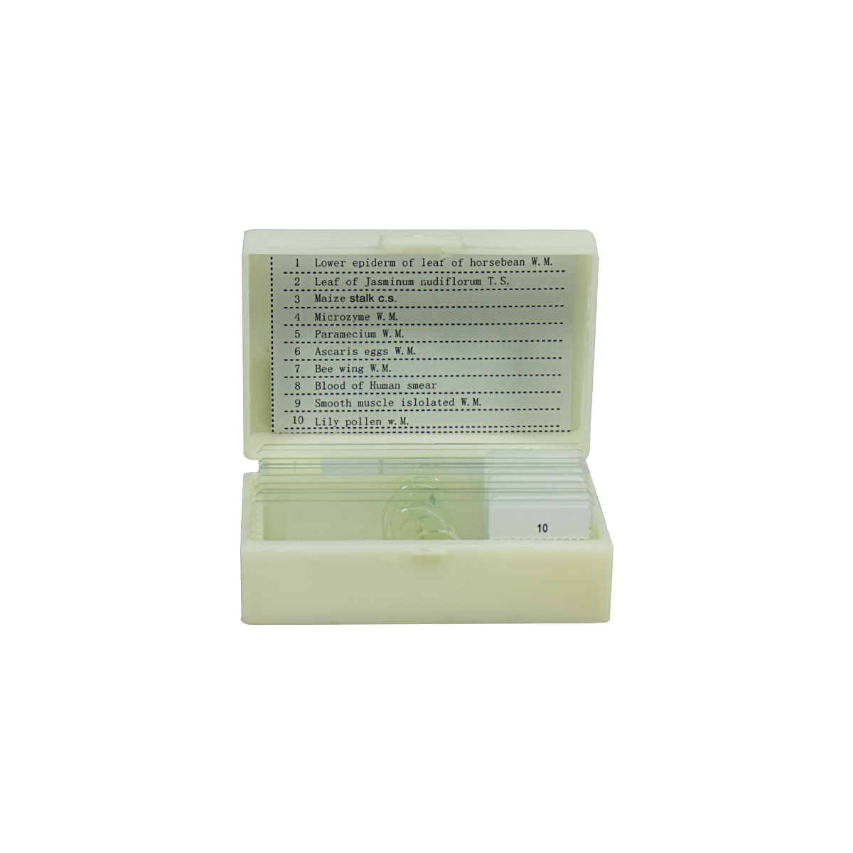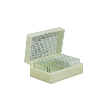 Specimen are secured in place and protected with a glass cover slip. Brand new slides are passed through quality control inspections for clean, scratch-free and uncontaminated slides.Slides are organized in numerical order. The indexed guide makes it easy to return slides in their places. The plastic box provides easy storage.