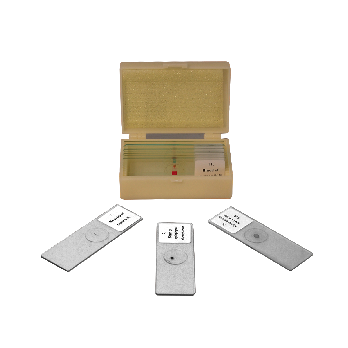 - A great starter set of 11 biology slides, including human anatomy, plant, and animal specimen.