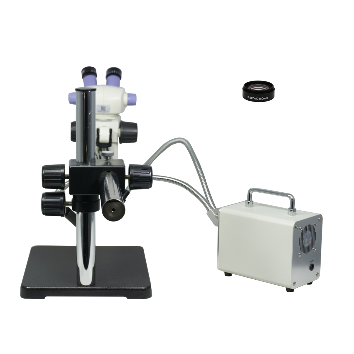 Finite. Total Magnification: 3.5-30X. 10X Adjustable Eyepiece. 0.5X Objective. Zoom Ratio: 1:4.3. Binocular. Body Mounting Size for Stand: Dia. 76mm. Eye Tube Angle: 45°. Eyepiece Field of View: Dia. 20mm. Boom Stand. LED Light. Light Adjustable. Gooseneck Dual Pipe Light . Input Voltage: AC 100-240V 50/60Hz.