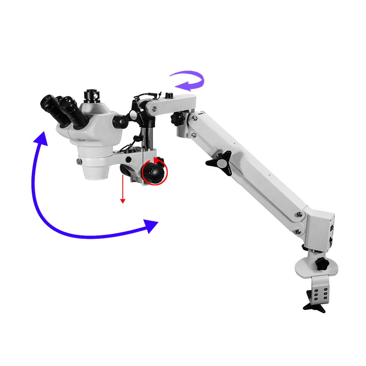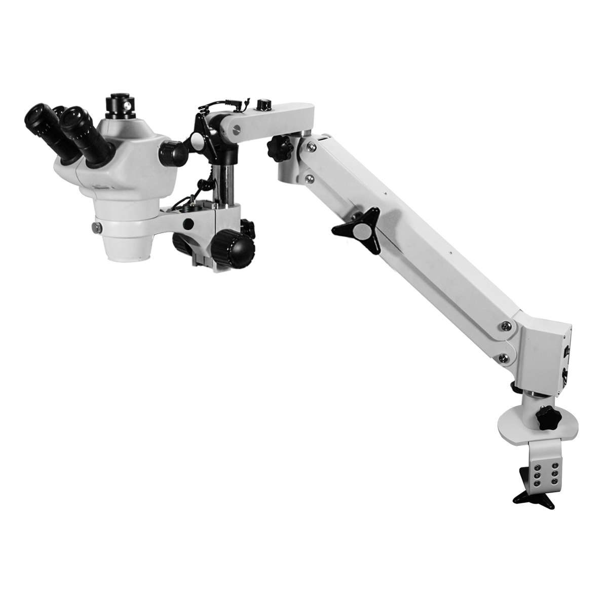 Finite. Total Magnification: 4-50X. 10X Adjustable Eyepiece. 0.5X Objective. Standard Coupler: 0.4X. Zoom Ratio: 1:6.3. Trinocular. Body Mounting Size for Stand: Dia. 76mm. Magnification Detent : 1X per pre-set stop. Eye Tube Angle: 45°. Eyepiece Field of View: Dia. 22mm. Pneumatic Arm. Total Arm Length: 940mm. Top Illumination: Oblique Top Light. Input Voltage: DC 12V.