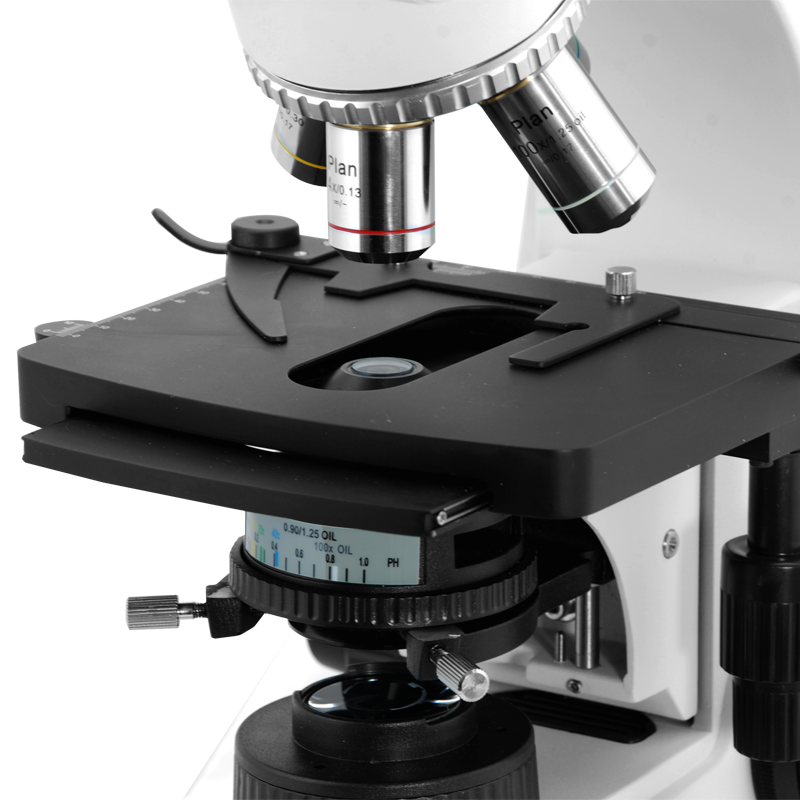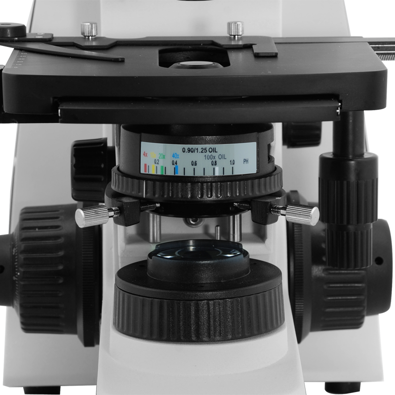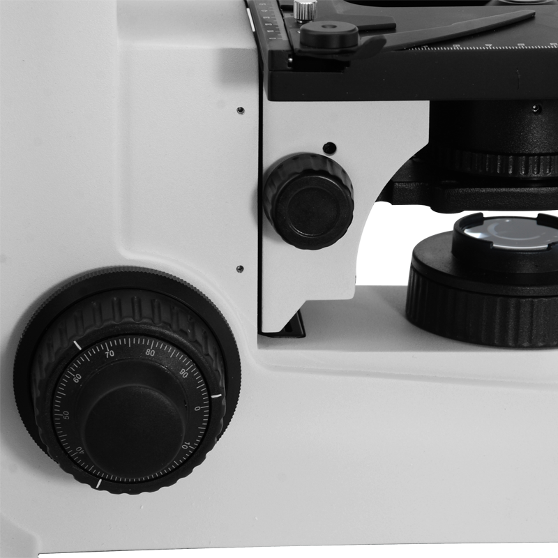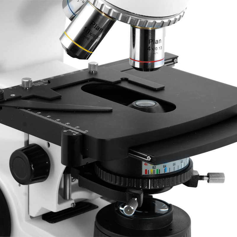 Infinite. Total Magnification: 40-1000X. 10X High Eyepoint Eyepiece. 4X 10X 40X 100X Infinity Plan Achromatic Objective. Standard Coupler: 1X. Eye Tube Angle: 30°. Eyepiece Field of View: Dia. 20mm. XY Stage Travel Distance: 75x50mm. Illumination Type: LED Coaxial Transmitted Light. Input Voltage: AC 100-240V 50/60Hz.