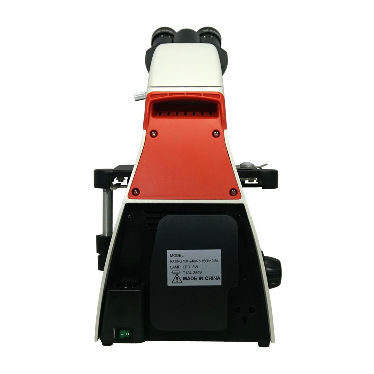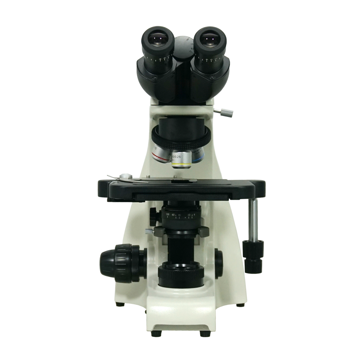 Infinite. Total Magnification: 40-1000X. 10X Adjustable Eyepiece. 4X 10X 40X 100X Infinity Plan Achromatic Objective. Eye Tube Angle: 30°. Eyepiece Field of View: Dia. 22mm. XY Stage Travel Distance: 80x50mm. Illumination Type: LED Coaxial Transmitted Light. Input Voltage: AC 100-240V 50/60Hz.