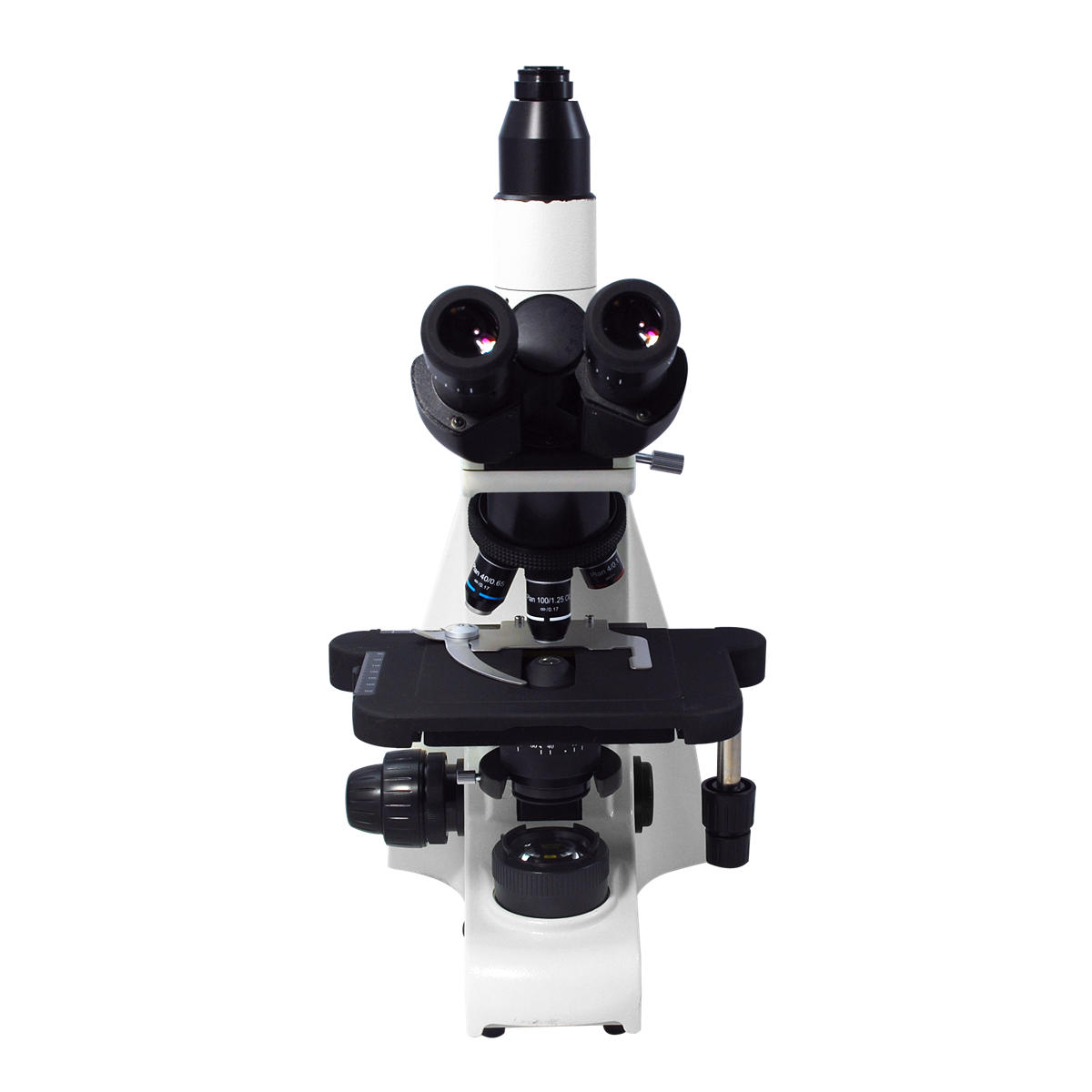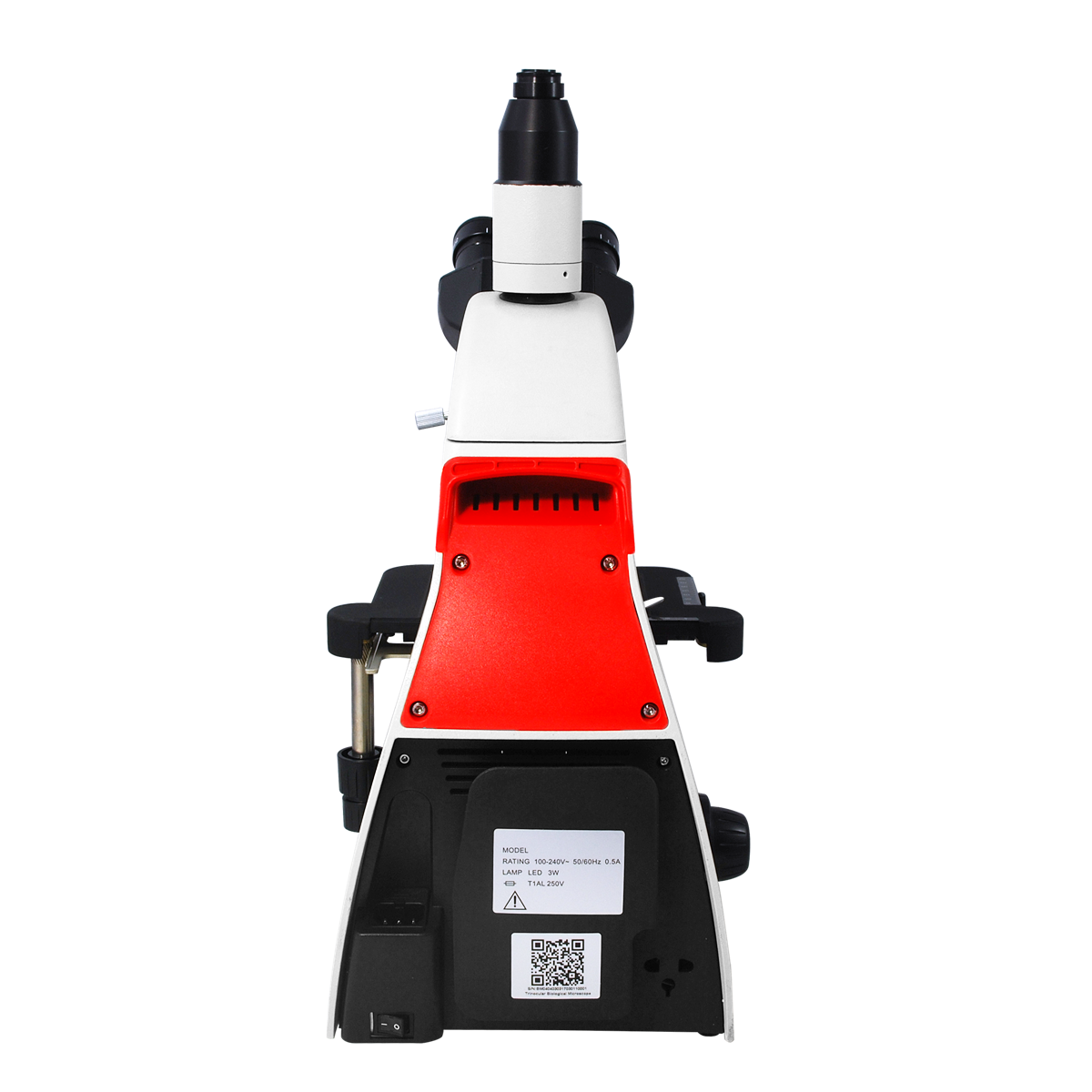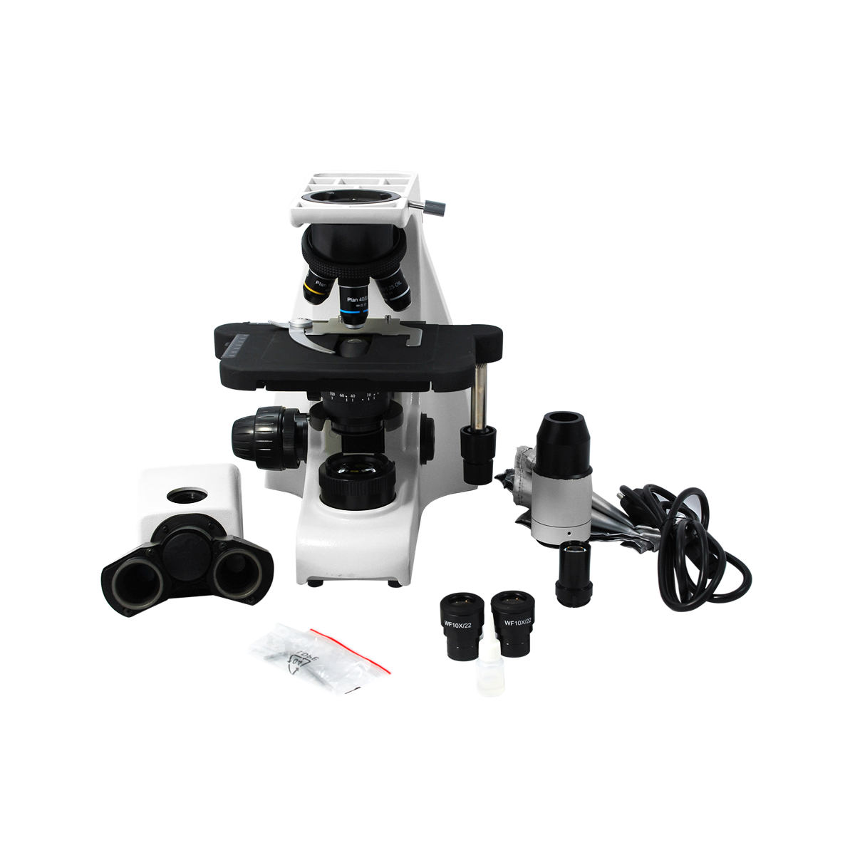 Infinite. Total Magnification: 40-1000X. 10X Adjustable Eyepiece. 4X 10X 40X 100X Infinity Plan Achromatic Objective. Standard Coupler: 0.5X. Eye Tube Angle: 30°. Eyepiece Field of View: Dia. 22mm. XY Stage Travel Distance: 80x50mm. Illumination Type: LED Coaxial Transmitted Light. Input Voltage: AC 100-240V 50/60Hz.