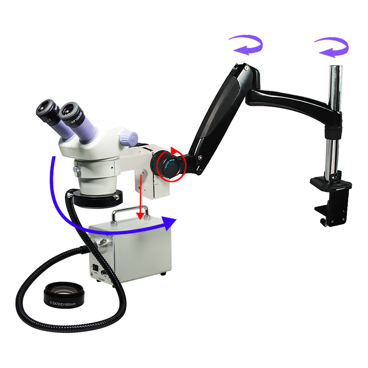 Finite. Total Magnification: 7-30X. 10X Adjustable Eyepiece. 1X Built-in Objective. Zoom Ratio: 1:4.3. Binocular. Body Mounting Size for Stand: Dia. 76mm. Eye Tube Angle: 45°. Eyepiece Field of View: Dia. 20mm. Pneumatic Arm. Total Arm Length: 600mm. LED Light. Light Adjustable. Ring Light. Input Voltage: AC 100-240V 50/60Hz.