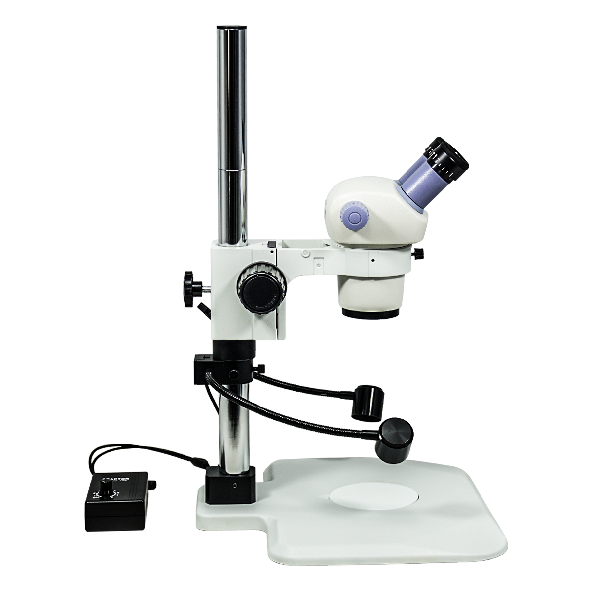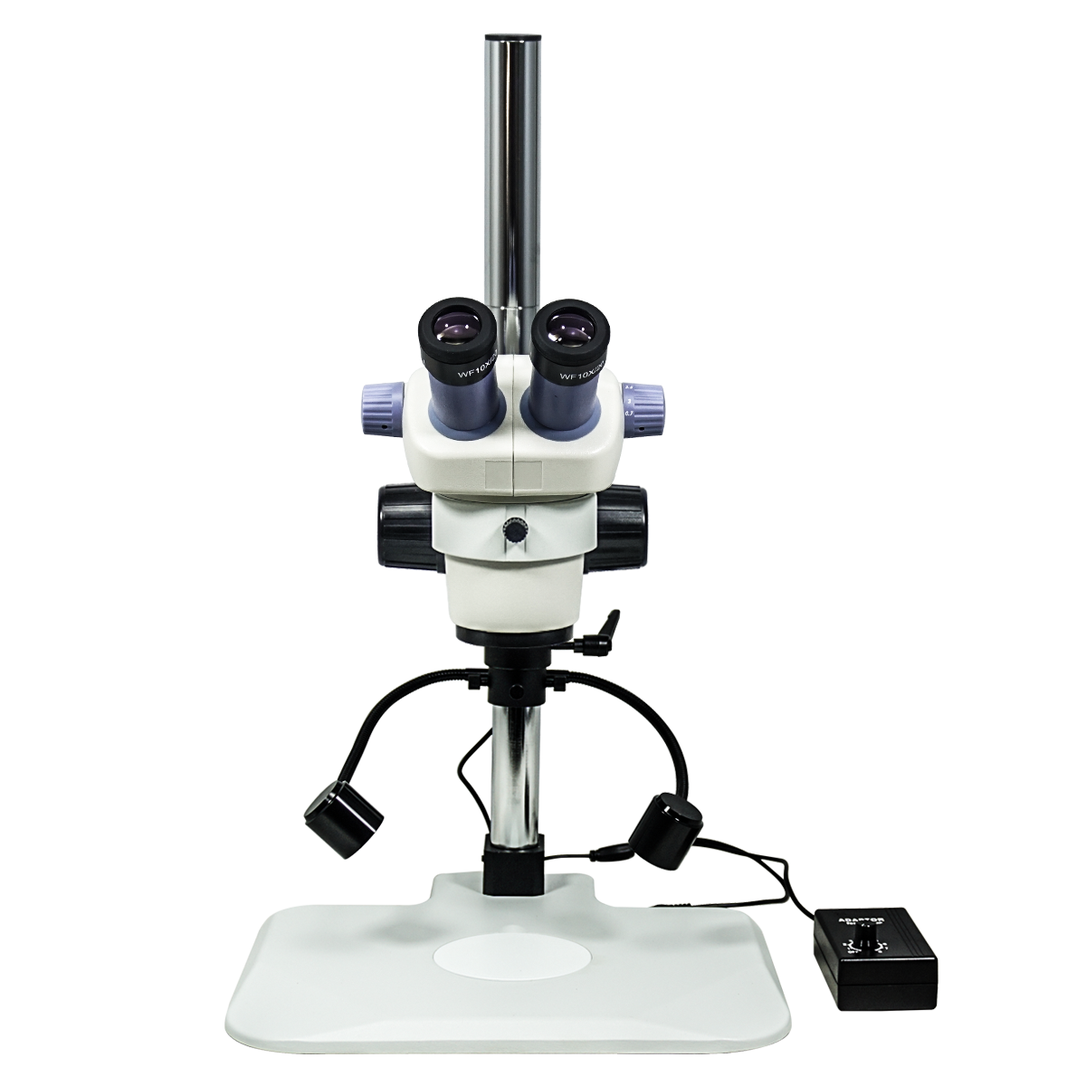 Finite. Total Magnification: 7-30X. 10X Adjustable Eyepiece. 1X Built-in Objective. Zoom Ratio: 1:4.3. Binocular. Body Mounting Size for Stand: Dia. 76mm. Eye Tube Angle: 45°. Eyepiece Field of View: Dia. 20mm. Post Stand. LED Light. Light Adjustable. Input Voltage: AC 100-240V 50/60Hz.