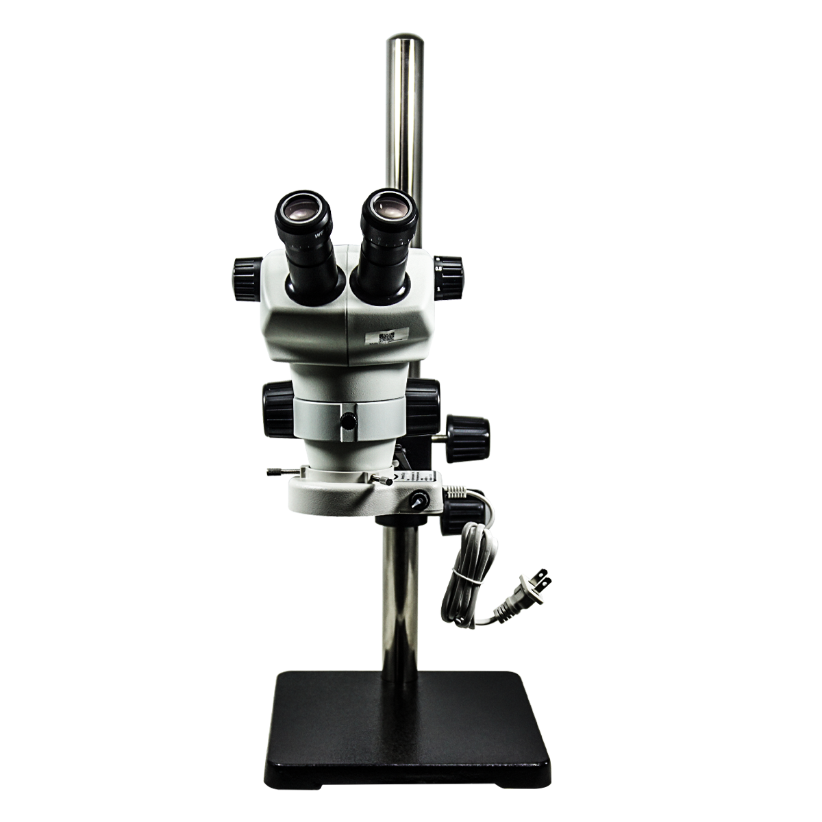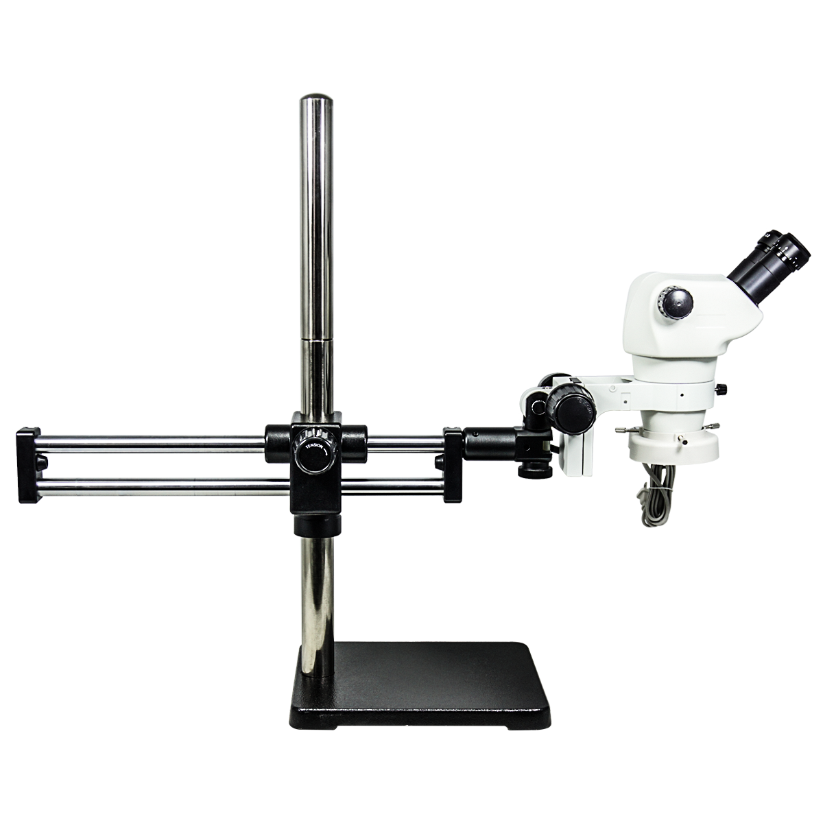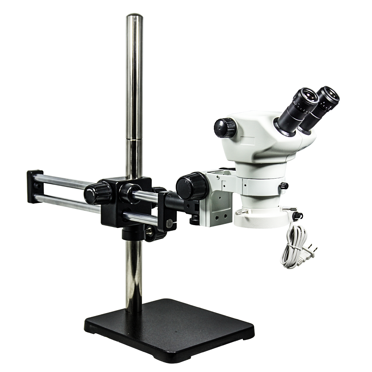 Finite. Total Magnification: 8-50X. 10X Adjustable Eyepiece. 1X Built-in Objective. Zoom Ratio: 1:6.3. Binocular. Body Mounting Size for Stand: Dia. 76mm. Magnification Detent : 1X per pre-set stop. Eye Tube Angle: 45°. Eyepiece Field of View: Dia. 22mm. Dual Arm Stand. LED Light. Light Adjustable. Input Voltage: AC 100-240V 50/60Hz.