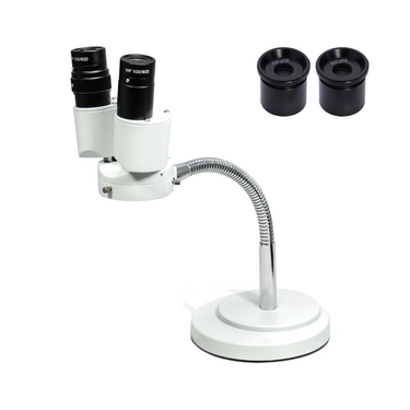 Finite. Total Magnification: 8X/16X. 10X 20X Eyepiece. 0.8X Built-in Objective. Binocular. Eye Tube Angle: 90°. Eyepiece Field of View: Dia. 10mm. Eyepiece Field of View: Dia. 20mm. Gooseneck Stand. Depth of Field: 6.5mm.
