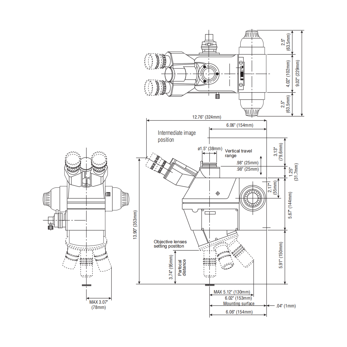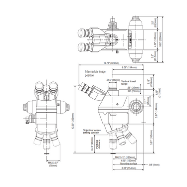 Infinite. Body Magnification: 1X. Body Mounting Size for Stand: 5-M4 Screw Holes, Depth 8mm, Screw Distance L126.5mm W63.5mm. Infinite. For Compound Microscope. Eye Tube Inner Diameter: Dia. 30mm. 0/100 Switch Trinocular. Coaxial Coarse/Fine Focus. Focus Distance: 50mm .