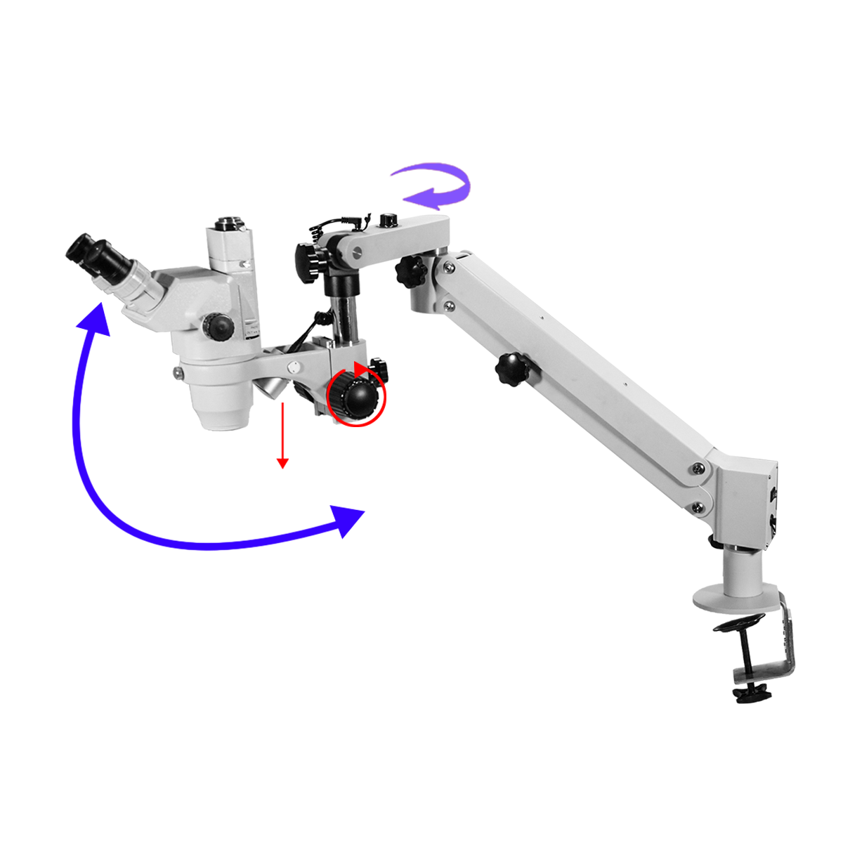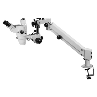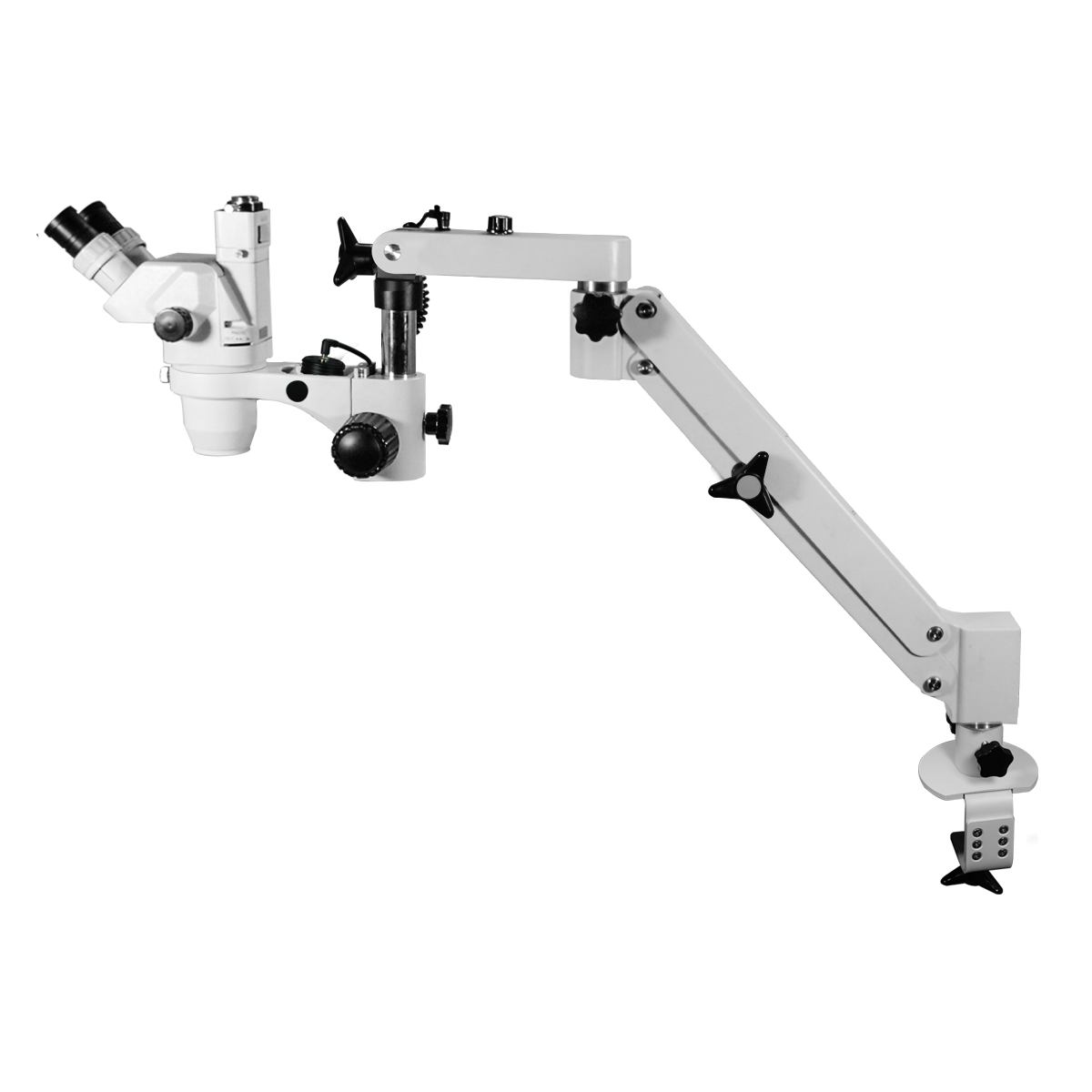 Finite. Total Magnification: 3.35-22.5X. 10X High Eyepoint Eyepiece. 0.5X Objective. Standard Coupler: 0.5X. Zoom Ratio: 1:6.7. Trinocular. Body Mounting Size for Stand: Dia. 76mm. Eye Tube Angle: 45°. Eyepiece Field of View: Dia. 22mm. Pneumatic Arm. Total Arm Length: 940mm. Top Illumination: Oblique Top Light. Input Voltage: DC 12V.