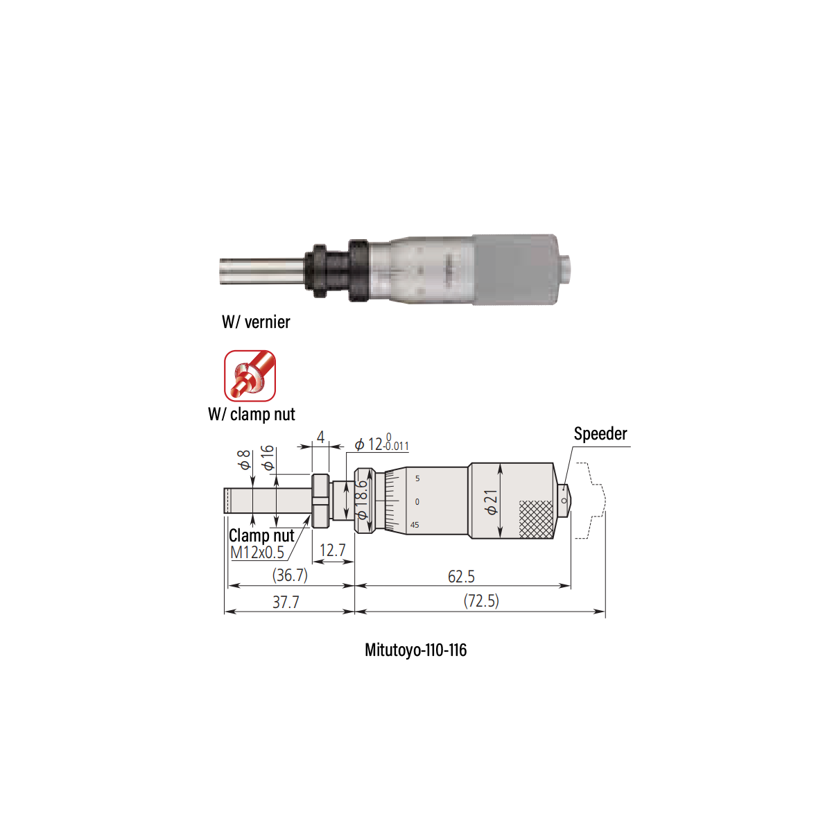 0-0.02″ Mechanical Micrometer Head Graduation 0.000005″ 0.02" Flat with Clamp Nut Extra-Fine Feeding Mechanical Micrometer Head (Thimble Diameter: Dia. 21mm, Spindle Diameter: Dia. 8mm, W/Vernier) Mitutoyo-110-116