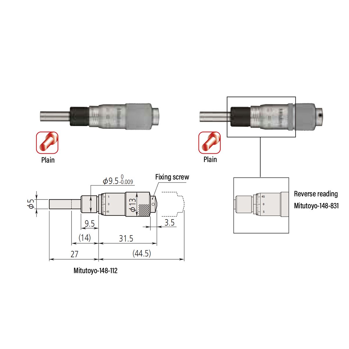 0-0.50″ Mechanical Micrometer Head Graduation 0.001″ 0.5" Flat Mechanical Micrometer Head (Thimble Diameter: Dia. 13mm, Reverse Reading) Mitutoyo-148-831