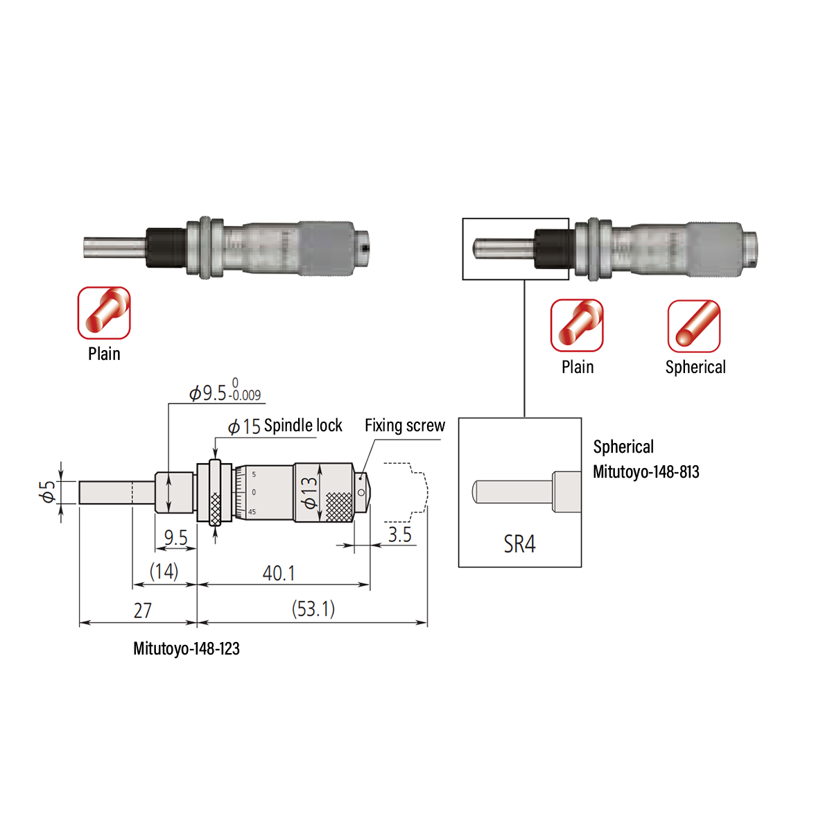 Digital Micrometer Head Measurement Range: 0-0.50 in. Spherical (SR4). Thimble diameter: Dia. 13mm. W/Spindle Lock. Mechanical Micrometer Head Graduation: 0.001 in.