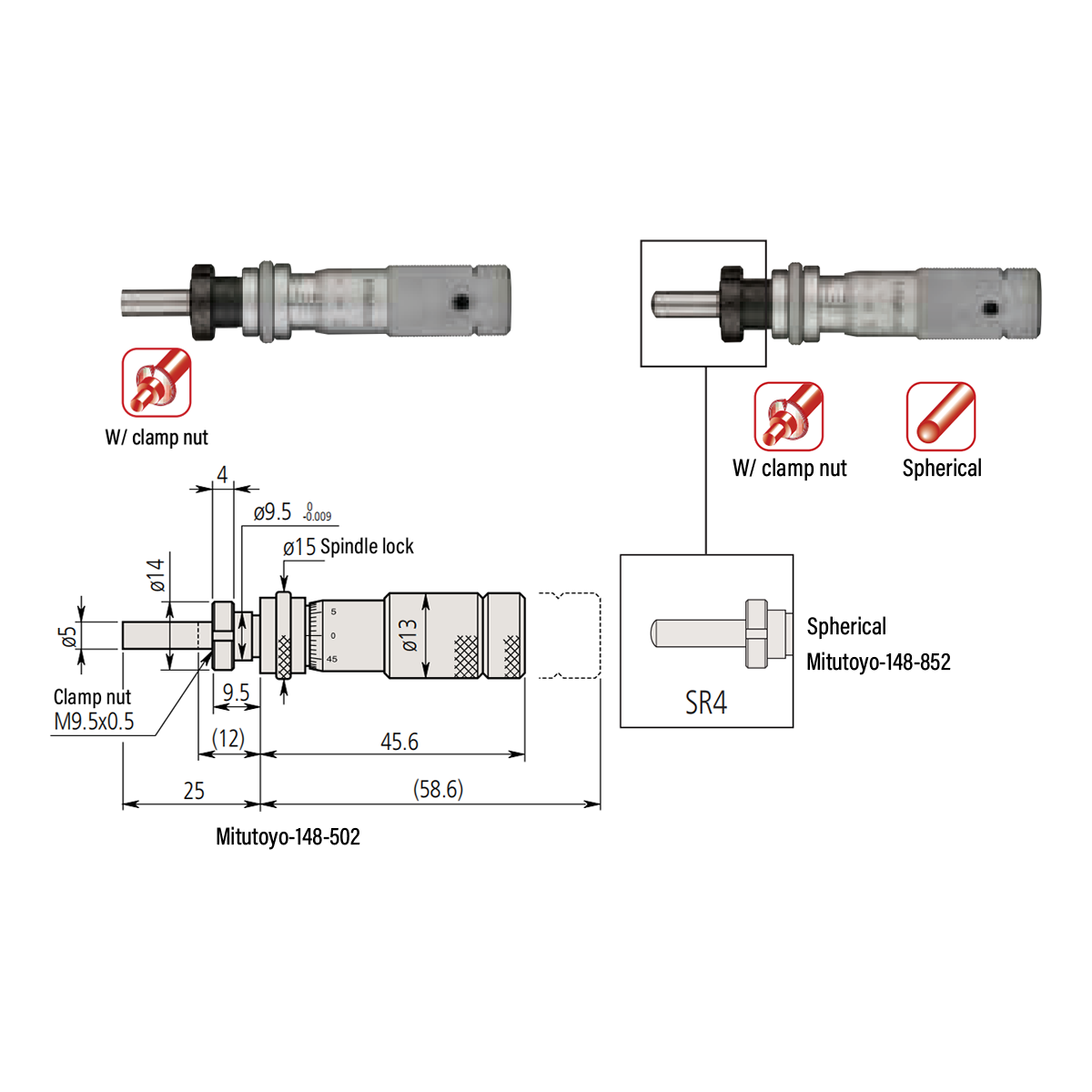 Mitutoyo-148-852 0.5" Spherical with Clamp Nut Zero-Adjustable Mechanical Micrometer Head (with Spindle Lock, Thimble Diameter: Dia. 13mm)