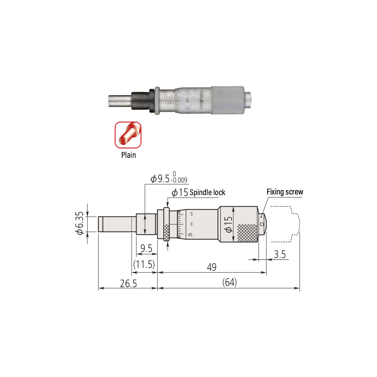 Mitutoyo-149-185-10 0.6" Flat Zero-Adjustable Mechanical Micrometer Head (with Spindle Lock, Thimble Diameter: Dia. 15mm)