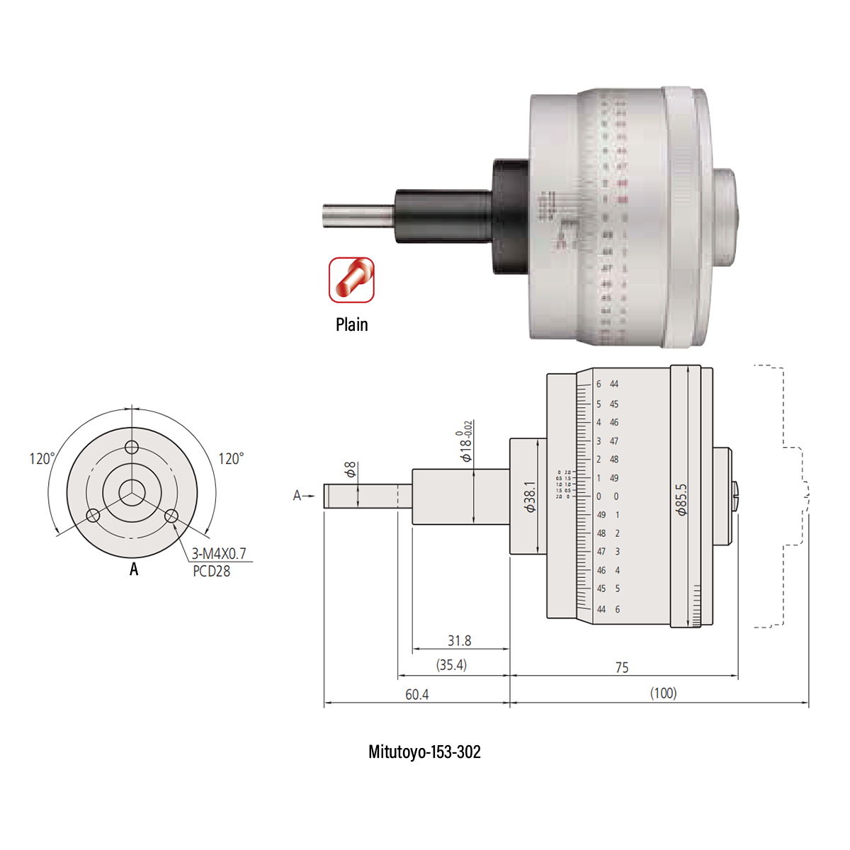 Mitutoyo-153-302 1" Flat Mechanical Micrometer Head (Thimble Diameter: Dia. 85.5mm, Spindle Diameter: Dia. 8mm, Bidirectional Grad)