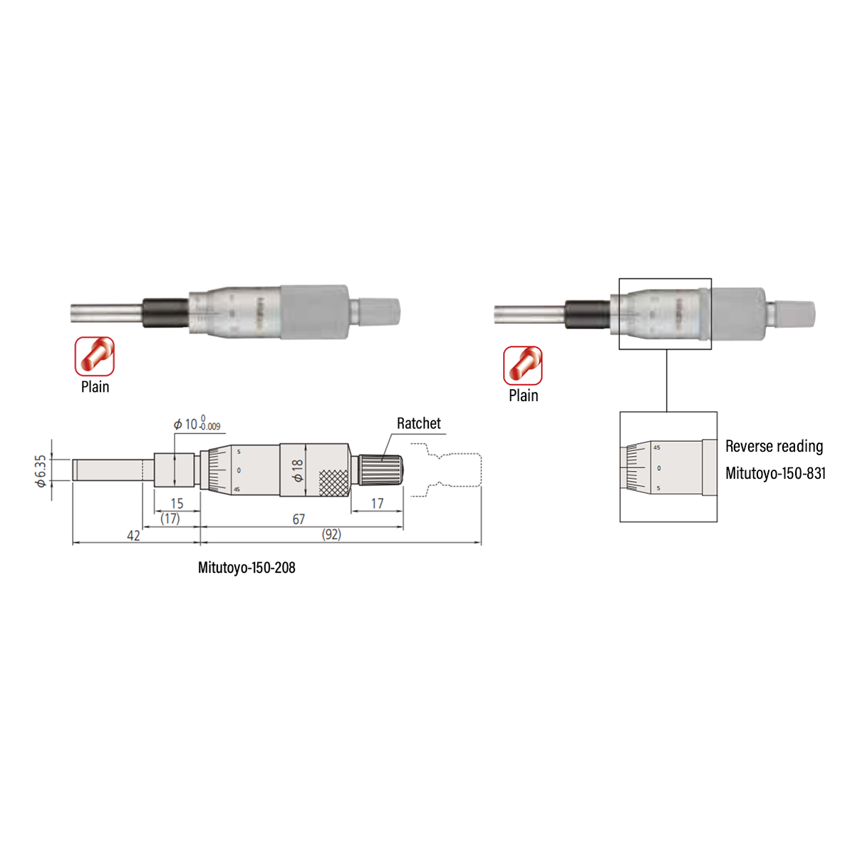 Mitutoyo-150-831 1" Flat Mechanical Micrometer Head (Thimble Diameter: Dia. 18mm, Reverse Reading)