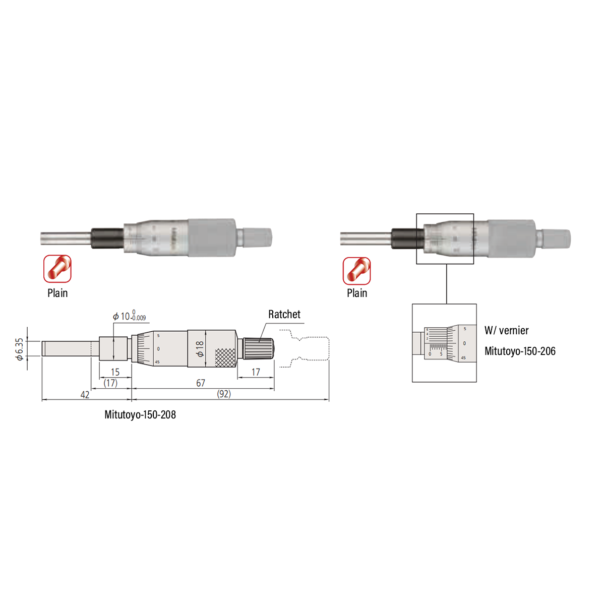 Mitutoyo-150-206 1" Flat Mechanical Micrometer Head (Thimble Diameter: Dia. 18mm, W/Vernier)