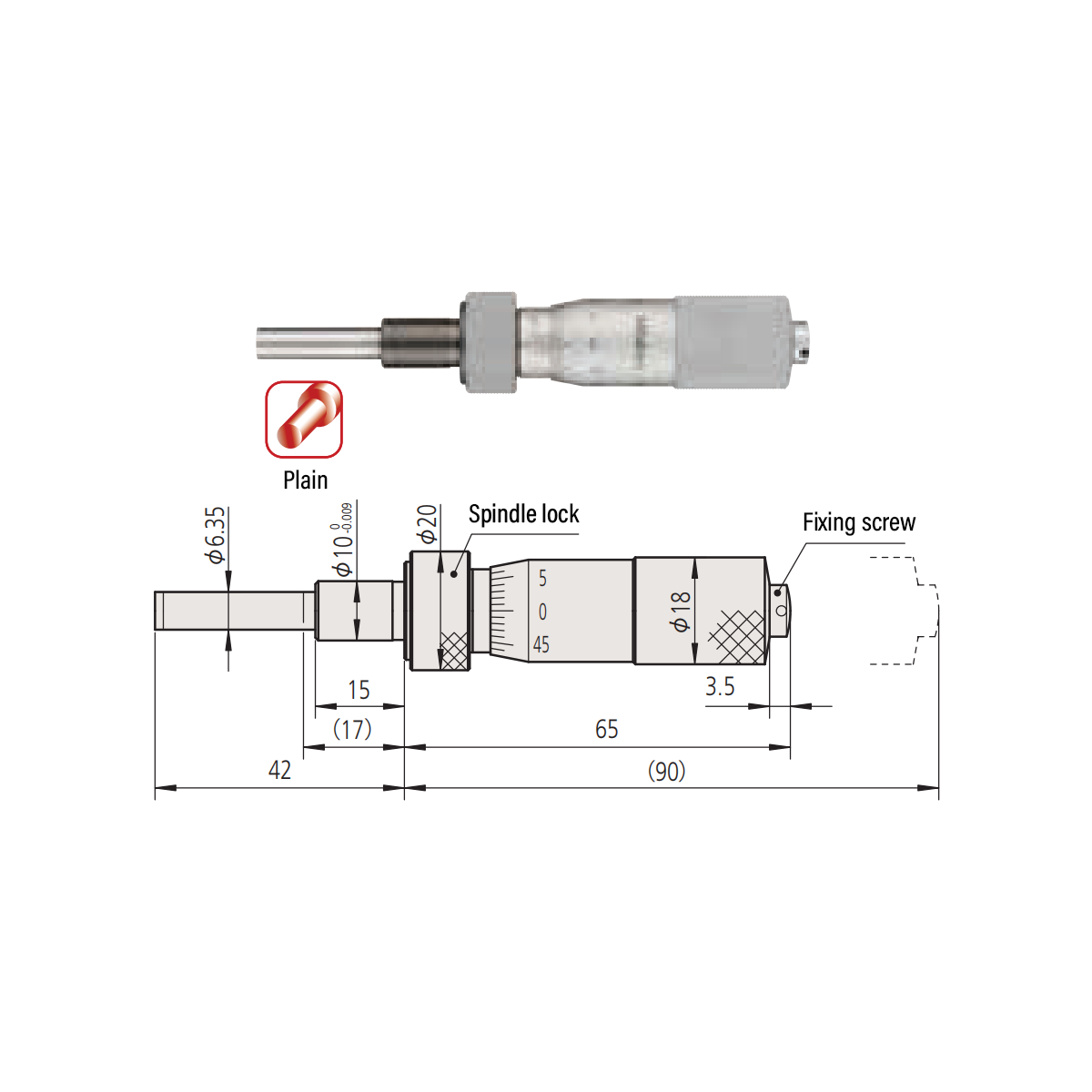 Mitutoyo-150-217-10 1" Flat Mechanical Micrometer Head (with Spindle Lock, Thimble Diameter: Dia. 18mm, Plain Thimble)