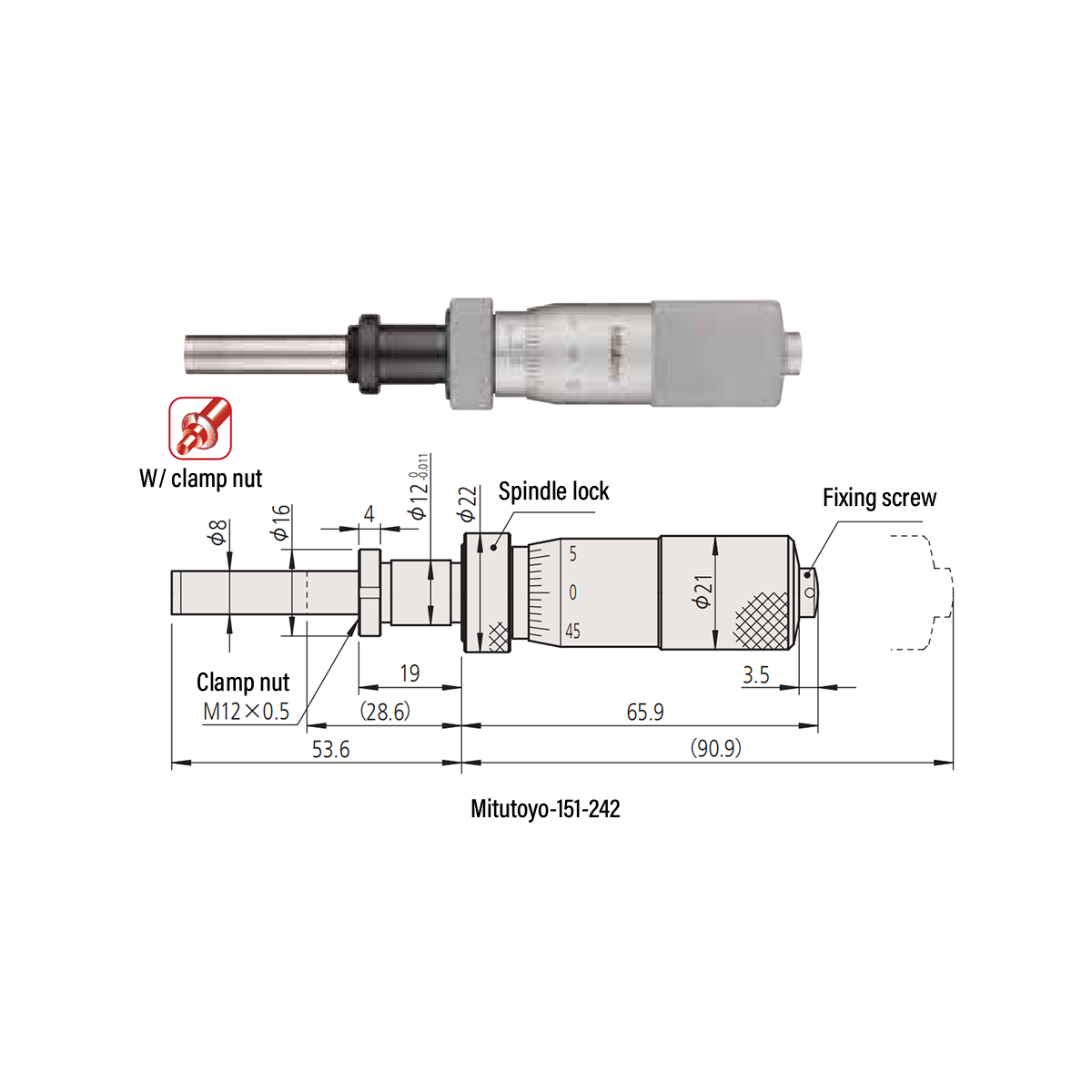 0-1″ Mechanical Micrometer Head Graduation 0.001″ 1" Flat with Clamp Nut Mechanical Micrometer Head (with Spindle Lock, Thimble Diameter: Dia. 21mm, Spindle Diameter: Dia. 8mm) Mitutoyo-151-242-10