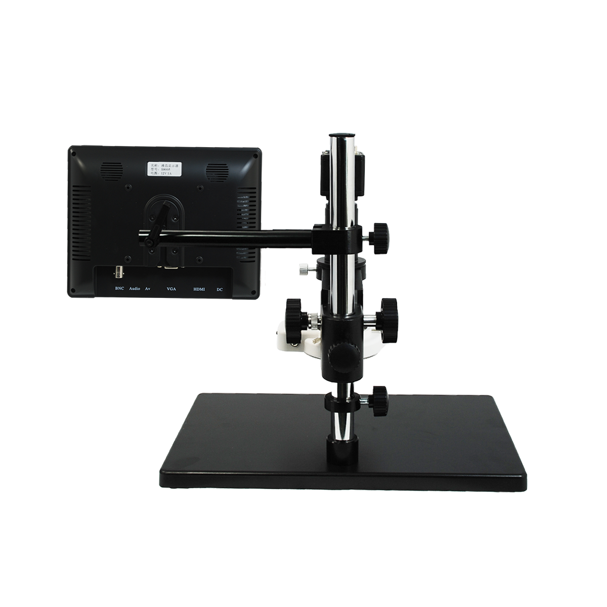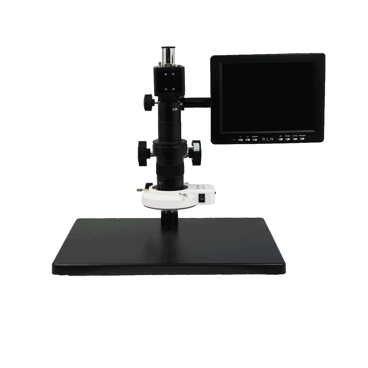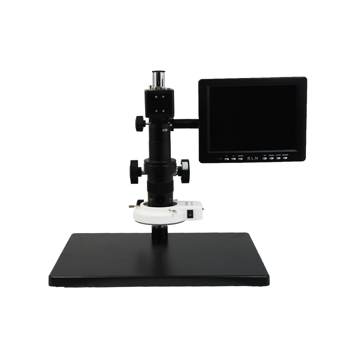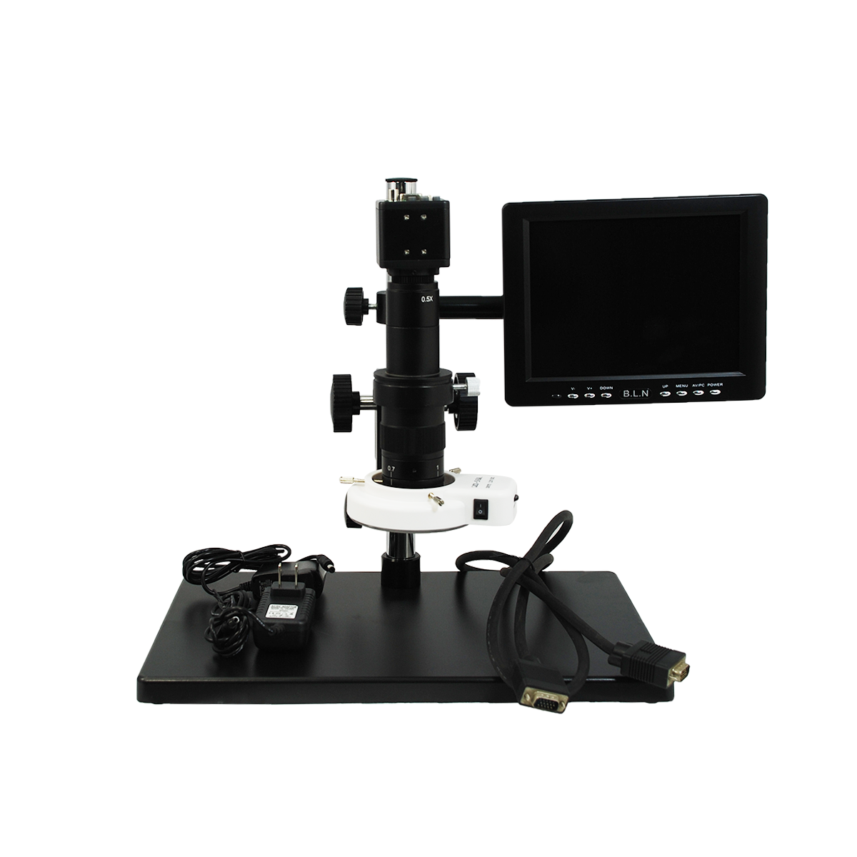 Finite. Total Magnification: 0.25-1.58X. 1X Objective. Standard Coupler: 0.35X. Zoom Ratio: 1:6.4. Body Mounting Size for Stand: Dia. 50mm. Post Stand. Illumination Type: LED Reflection Light. LED Light. Light Adjustable. CMOS. 2.0 Megapixels. VGA. Screen Size: 8in. Input Voltage: AC 100-240V 50/60Hz. Input Voltage: DC 12V. VGA Color Digital Camera,8” LCD Color Monitor,Monitor Holder,LED Ring Light.