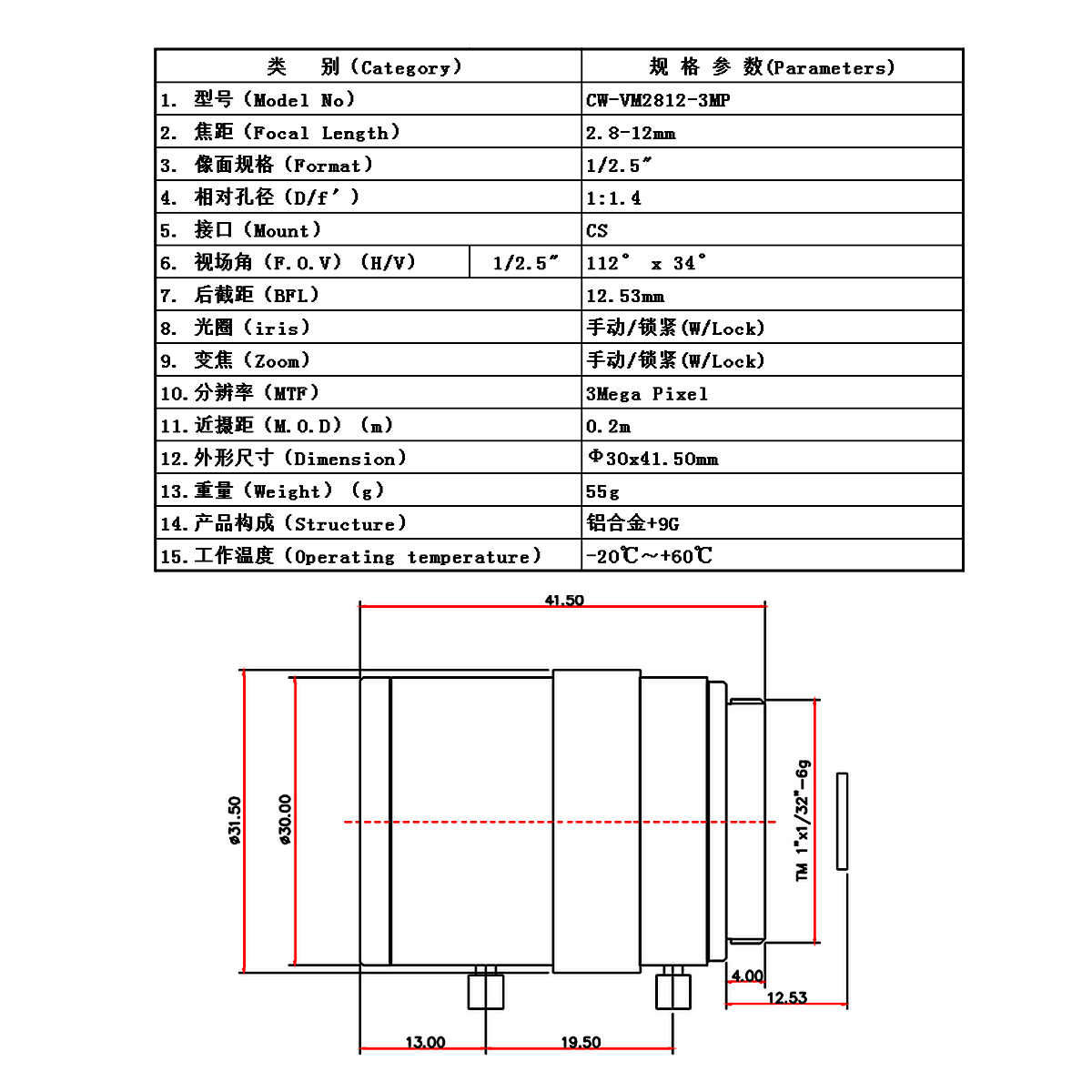 Objective Zoom Rang: 2.8-12mm. Minimum Photographic Distance: 0.2mm. F-Number: 1:1.4.