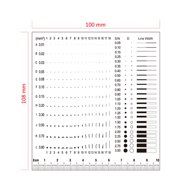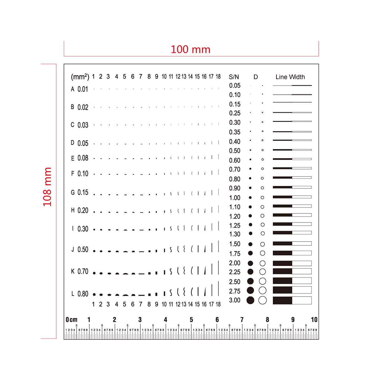 Multi-Function Film Ruler . Film Ruler Dimensions: 108x100x0.1mm. 100mm/200 Div. Line Length (Width): W: 0.05-3.0mm. Diameters Range: Dia. 0.05-3.00mm. Area Measurement Type: 18 Species. Area Measurement Range: 0.01-0.80mm².