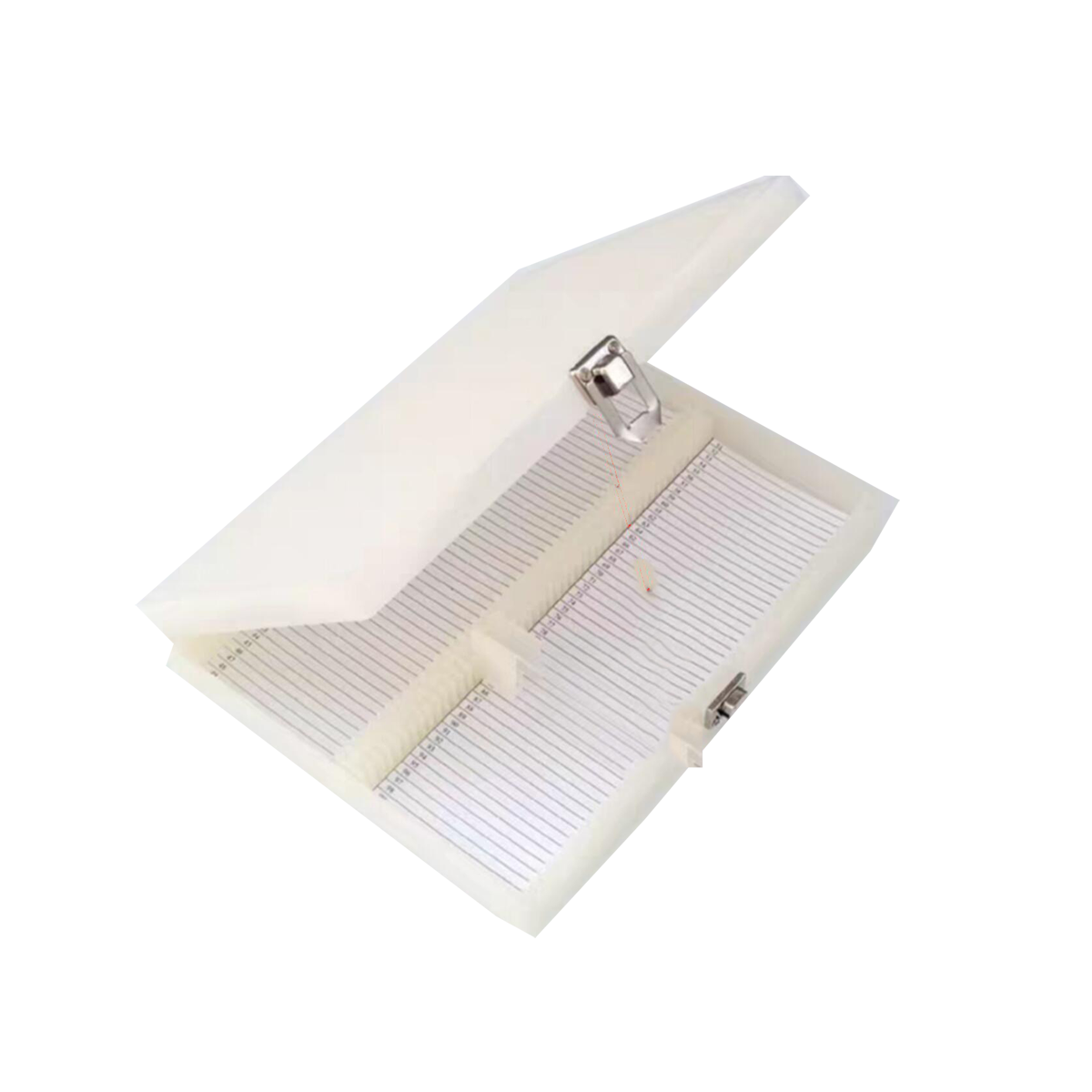 Glass Slide Quantity per Pack: 100pc. Storage Box. Main Material: Plastic, Clasp Material: Rust-resistant Metal. Case Dimensions: 20x17x3cm. Closure: Rust-resistant Metal Clasp to Secure Lid.
