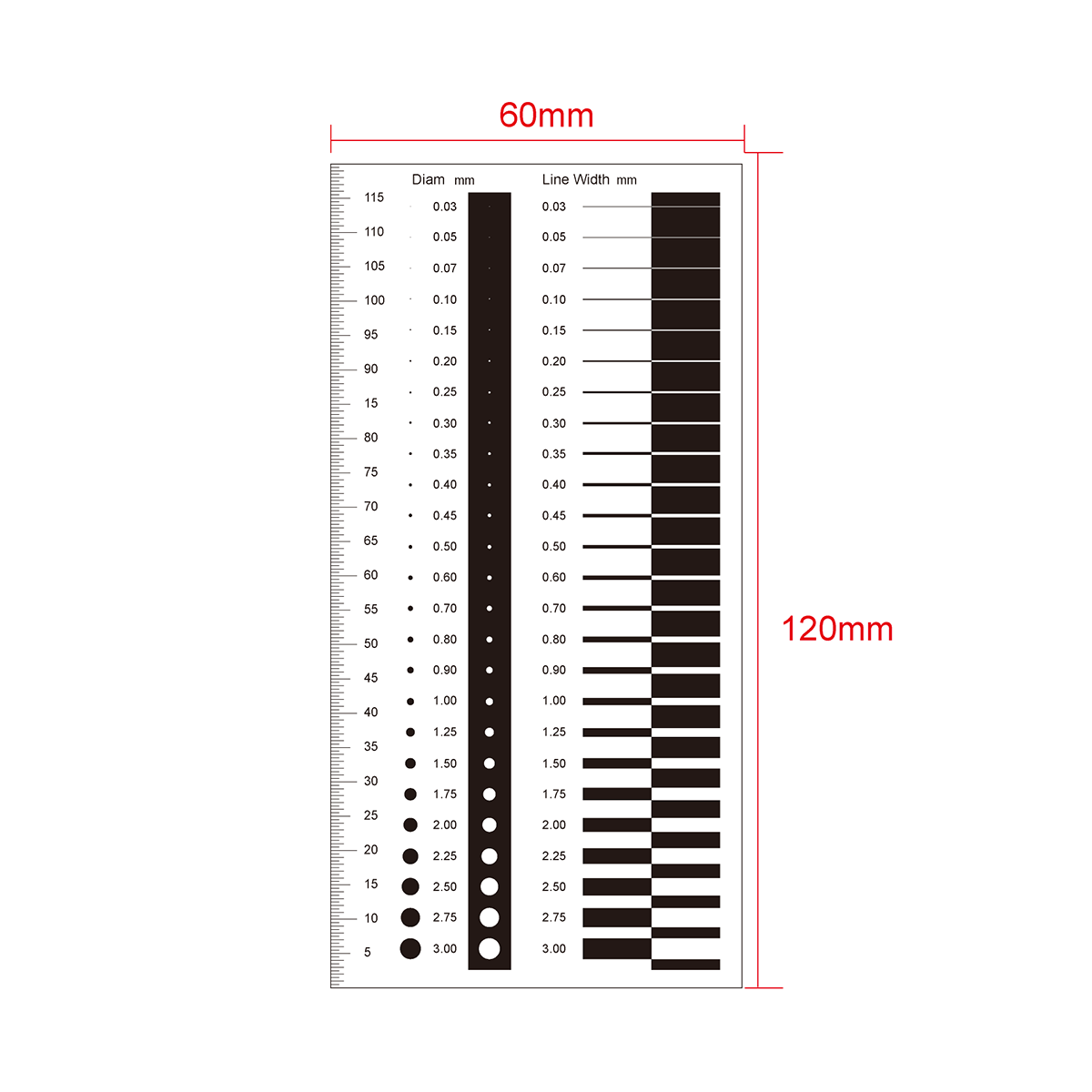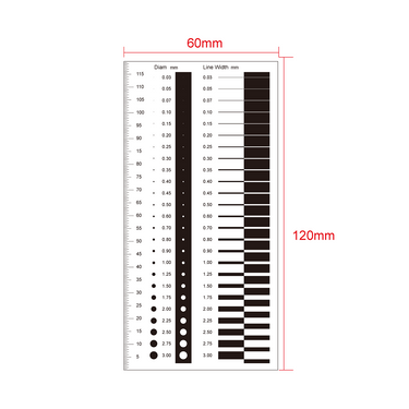 Multi-Function Film Ruler . Film Ruler Dimensions: 120x60x0.1mm. 120mm/240 Div. Line Length (Width): W: 0.03-3.0mm. Diameters Range: Dia. 0.03-3.0mm.