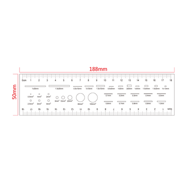 Multi-Function Film Ruler . Film Ruler Dimensions: 188x50x0.1mm. 180mm/180 Div. Line Length (Width): L: 1.5-25mm, W: 0.1-2.0mm. Area Measurement Type: 1 Species. Area Measurement Range: 0.5-100mm².