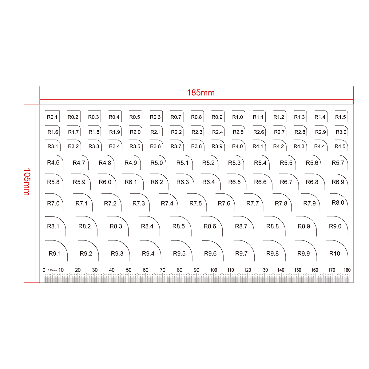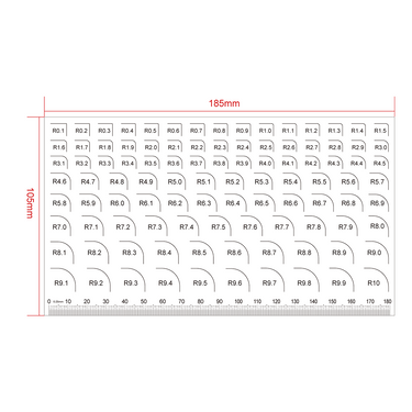Transparent Ruler. Film Ruler Dimensions: 185x105x0.1mm. 180mm/720 Div. R0.1-10mm.