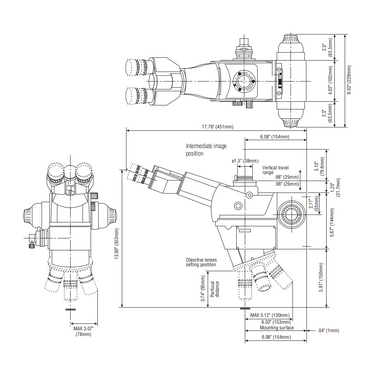 Infinite. Body Magnification: 1X. Body Mounting Size for Stand: 4-M4 Screw Holes, Depth 6mm, Screw Distance L126.5mm W63.5mm. Infinite. For Compound Microscope. Eye Tube Angle: 0-20° . Eye Tube Inner Diameter: Dia. 30mm. 0/100 Switch Trinocular. Coaxial Coarse/Fine Focus. Focus Distance: 50mm .