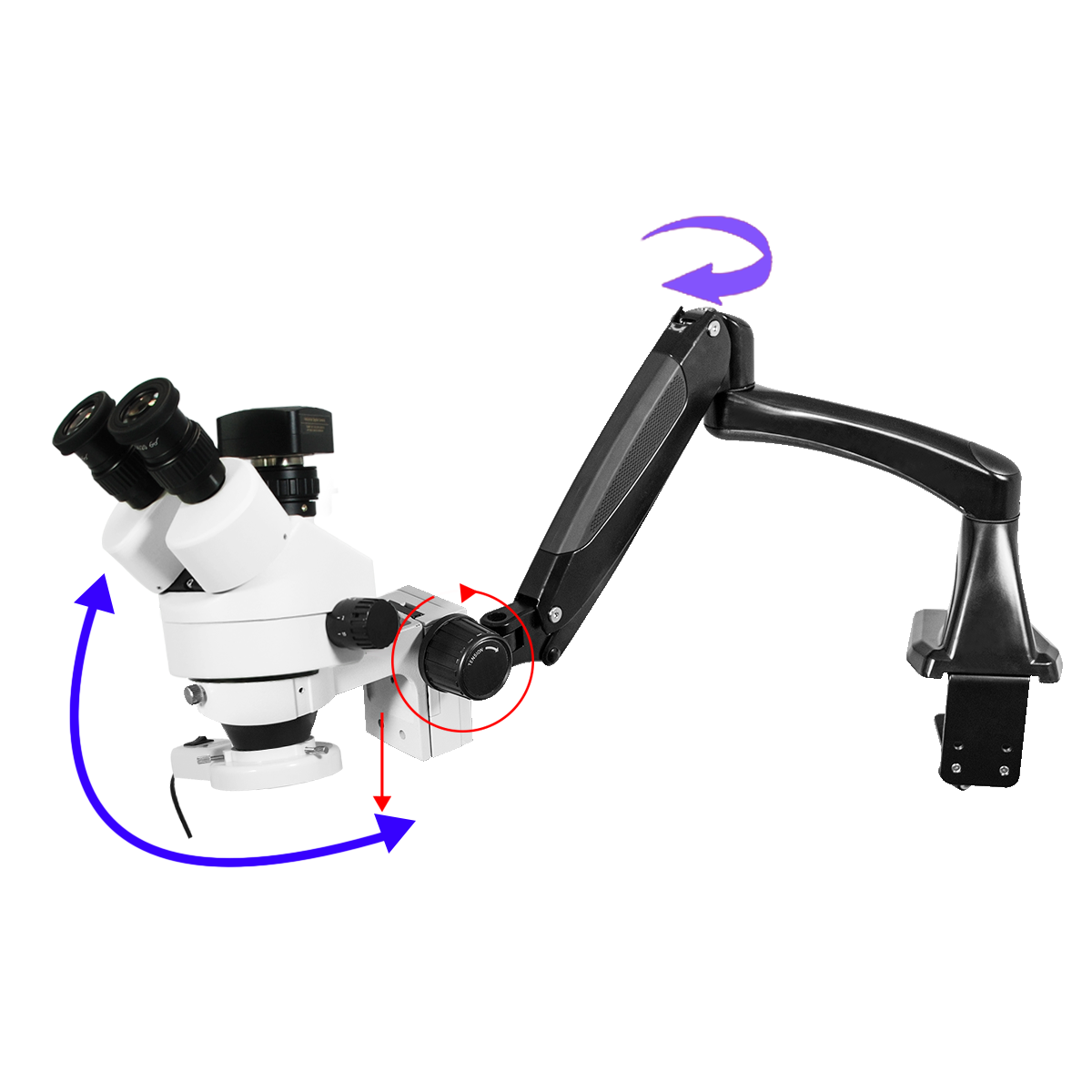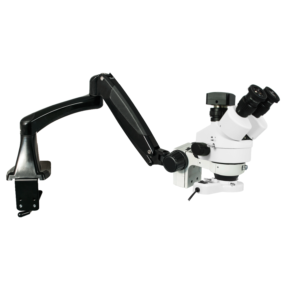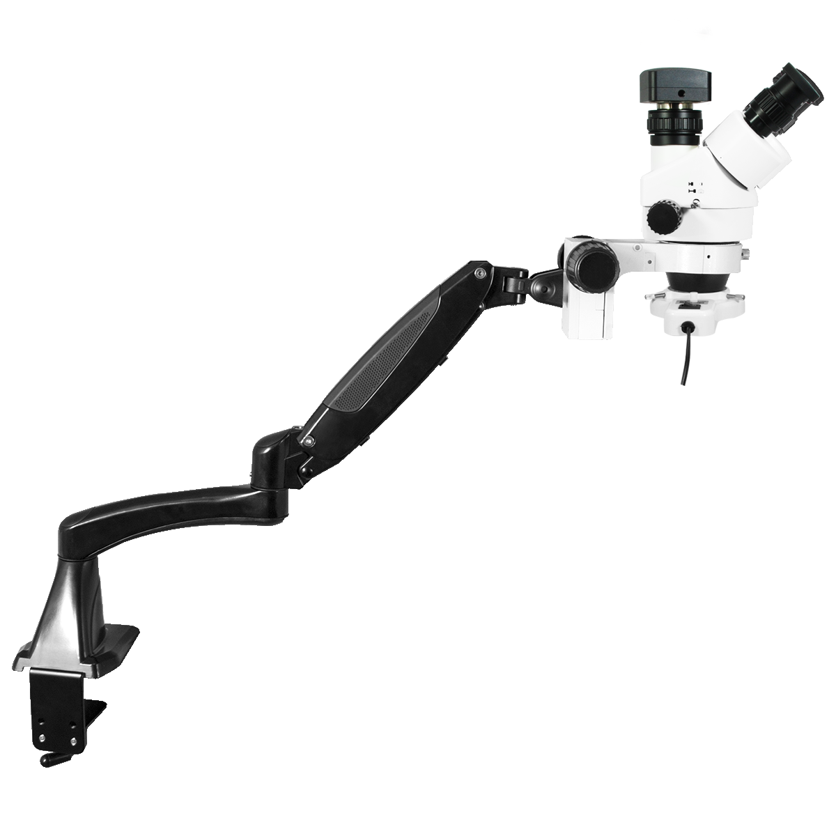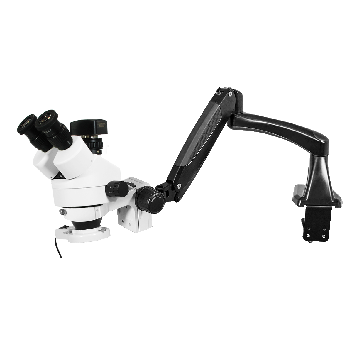 Finite. Total Magnification: 7-45X. 10X High Eyepoint Eyepiece. 1X Built-in Objective. Standard Coupler: 0.5X. Zoom Ratio: 1:6.4. Trinocular. Body Mounting Size for Stand: Dia. 76mm. Eye Tube Angle: 45°. Eyepiece Field of View: Dia. 20mm. Pneumatic Arm. Total Arm Length: 600mm. LED Light. Light Adjustable. CMOS. 3.0 Megapixels. USB 2.0. Windows XP/Vista/7/8/10/11/OSX/Linux 2.6 and above. Input Voltage: AC 100-240V 50/60Hz.
