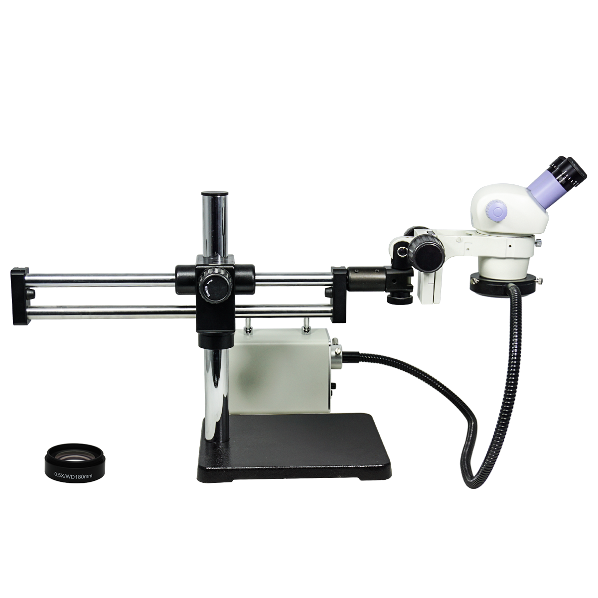 Finite. Total Magnification: 3.5-30X. 10X Adjustable Eyepiece. 0.5X Objective. Zoom Ratio: 1:4.3. Binocular. Body Mounting Size for Stand: Dia. 76mm. Eye Tube Angle: 45°. Eyepiece Field of View: Dia. 20mm. Dual Arm Stand. LED Light. Light Adjustable. Ring Light. Input Voltage: AC 100-240V 50/60Hz.