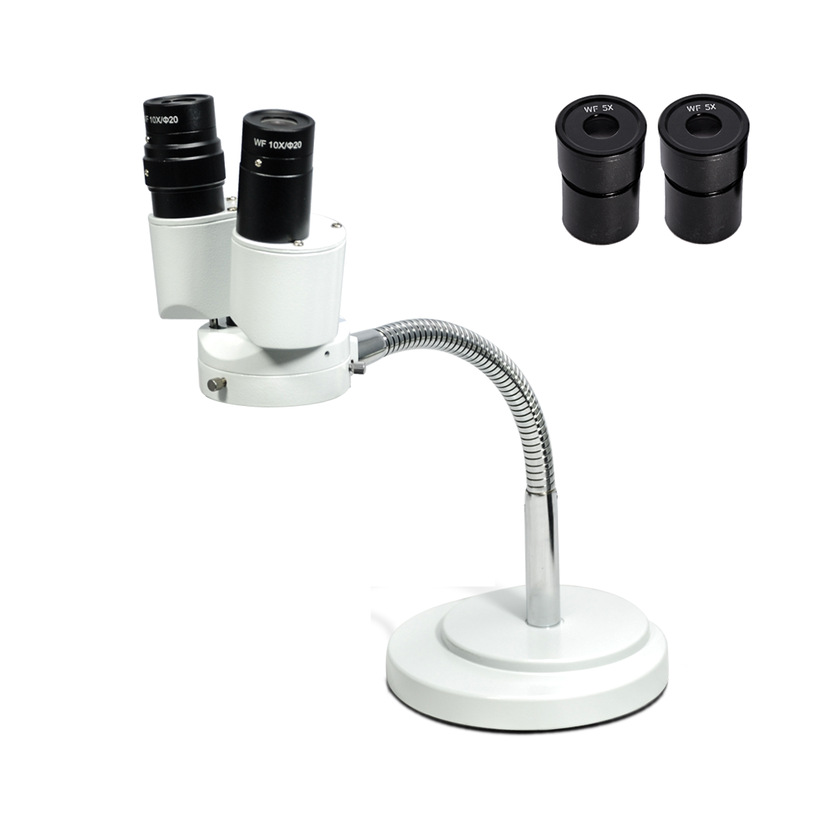 Finite. Total Magnification: 4X/8X. 10X 5X Eyepiece. 0.8X Built-in Objective. Binocular. Eye Tube Angle: 90°. Eyepiece Field of View: Dia. 20mm. Gooseneck Stand. Depth of Field: 6.5mm.