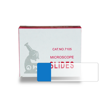 - 50 premium clear glass microscope slides with one end frosted (blue).