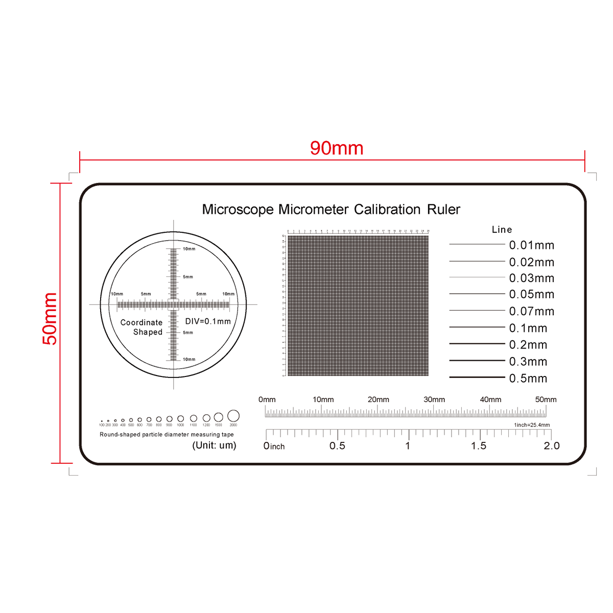 Line Gauge. Film Ruler Dimensions: 90x50x0.1mm. 50mm/200 Div, 2.0Inch/40 Div, 20mm/200 Div, 25x25mm/250x250 Net Grid. Line Length (Width): W: 0.01-0.5mm. Diameters Range: Dia. 0.1-2.0mm.