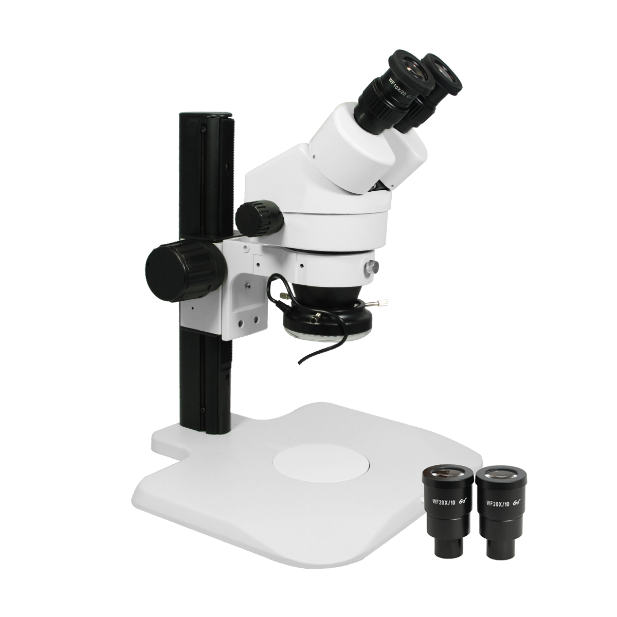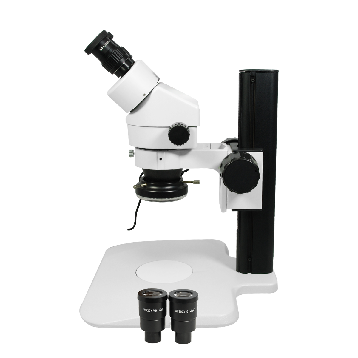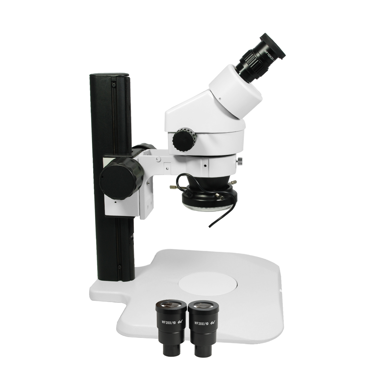Finite. Total Magnification: 7-90X. 10X 20X High Eyepoint Eyepiece. 1X Built-in Objective. Zoom Ratio: 1:6.4. Binocular. Body Mounting Size for Stand: Dia. 76mm. Eye Tube Angle: 45°. Eyepiece Field of View: Dia. 10mm. Eyepiece Field of View: Dia. 20mm. Track Stand. LED Light. Light Adjustable. Input Voltage: AC 90-265V 50/60Hz.