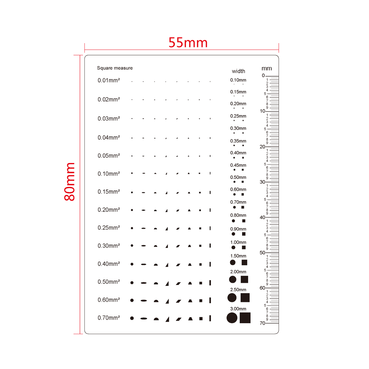 Multi-Function Film Ruler . Film Ruler Dimensions: 80x55x0.1mm. 70mm/140 Div. Diameters Range: Dia. 0.1-3.0mm. Area Measurement Type: 8 Species. Area Measurement Range: 0.01-0.70mm².
