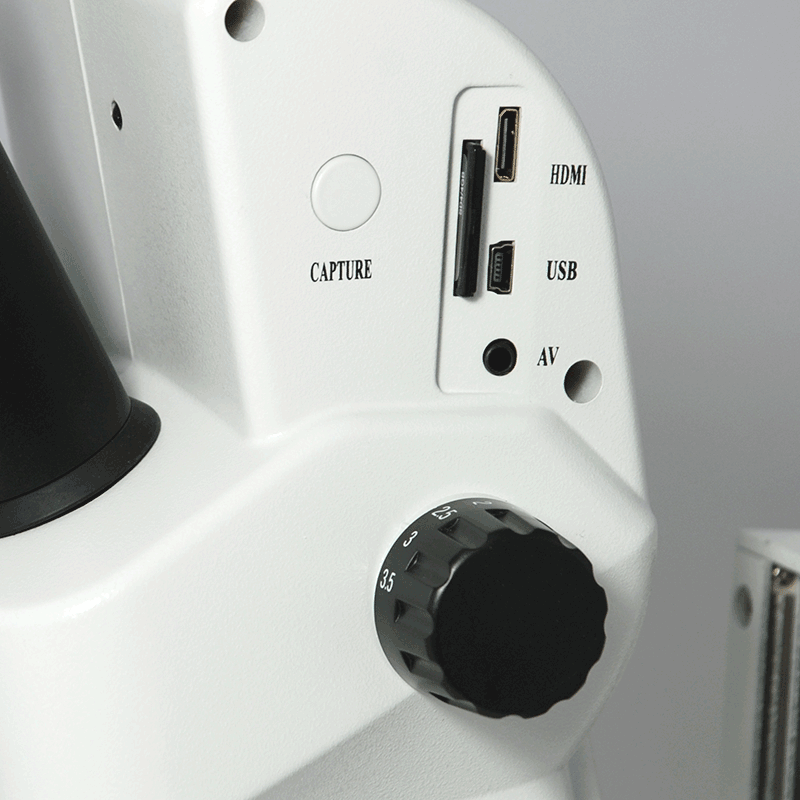 Finite. Total Magnification: 8-35X. 10X Adjustable Eyepiece. 1X Built-in Objective. Eye Tube Angle: 60°. Eyepiece Field of View: Dia. 22mm. Illumination Type: LED Dual Illuminated Light . Top Illumination: Oblique Top Light. CMOS. 5.0 Megapixels. HDMI / USB 2.0 / AV. Input Voltage: AC 100-240V 50/60Hz.