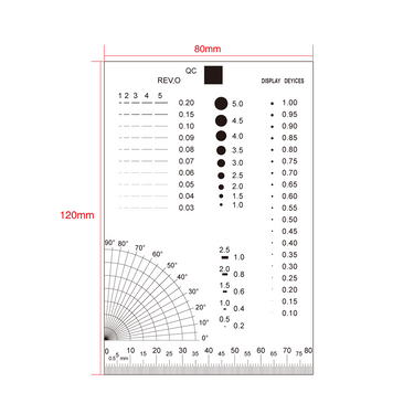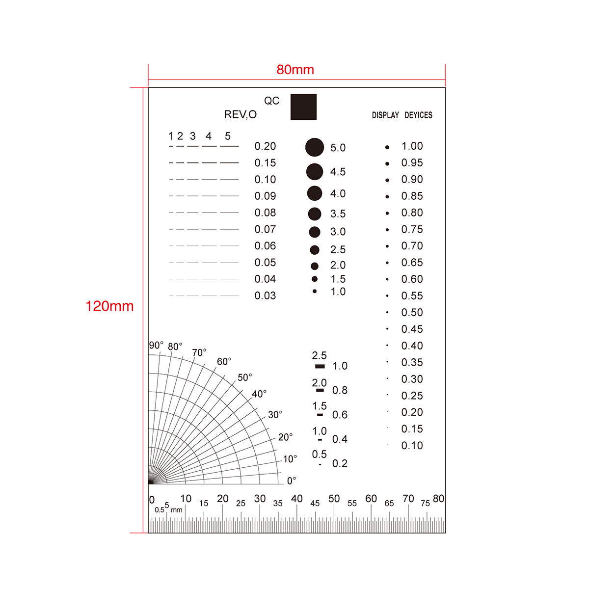 Multi-Function Film Ruler . Film Ruler Dimensions: 120x80x0.1mm. 80mm/160 Div. Line Length (Width): L: 1-5mm, W: 0.03-1.0mm. Diameters Range: Dia. 0.1-5.0mm. 0-90°.