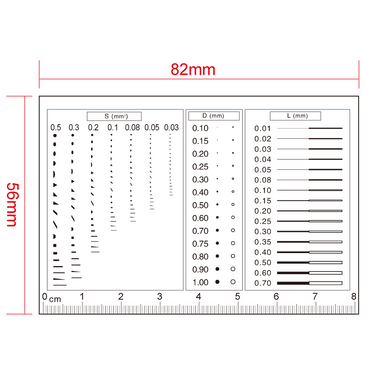 Multi-Function Film Ruler . Film Ruler Dimensions: 82x56x0.1mm. 80mm/160 Div. Line Length (Width): W: 0.01-0.70mm. Diameters Range: Dia. 0.1-1.0mm. Area Measurement Type: 18 Species. Area Measurement Range: 0.03-0.5mm².