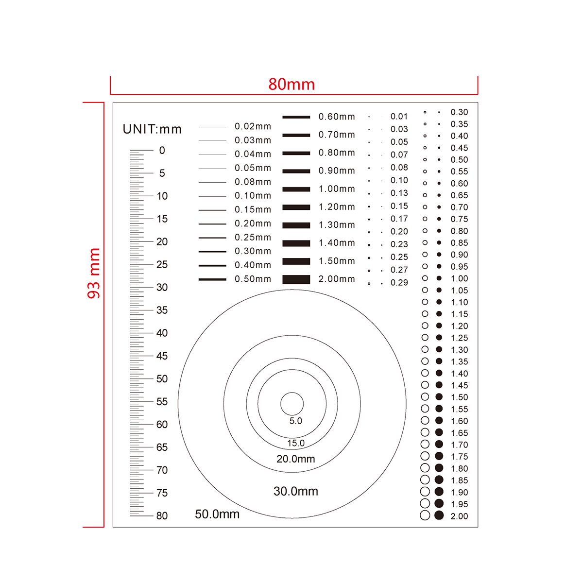 Multi-Function Film Ruler . Film Ruler Dimensions: 93x80x0.1mm. 80mm/160 Div. Line Length (Width): W: 0.02-2.00mm. Diameters Range: Dia. 0.01-50.0mm.