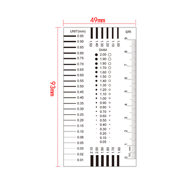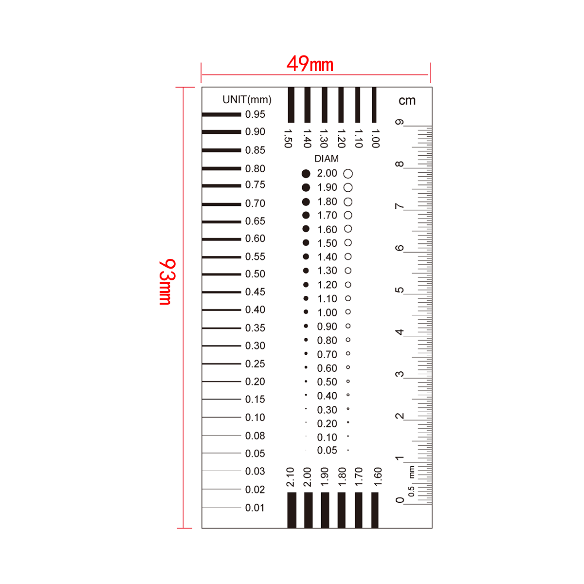 Multi-Function Film Ruler . Film Ruler Dimensions: 93x49x0.1mm. 90mm/180 Div. Line Length (Width): W: 0.01-2.10mm. Diameters Range: Dia. 0.05-2.00mm.