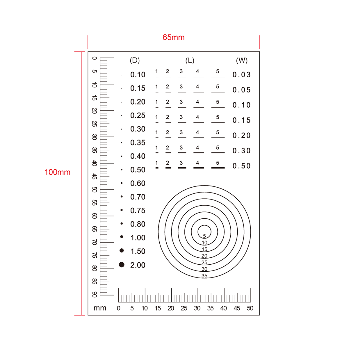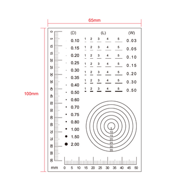 Multi-Function Film Ruler . Film Ruler Dimensions: 100x65x0.1mm. 90mm/90 Div. Line Length (Width): L: 1-5mm, W: 0.03-0.50mm. Diameters Range: Dia. 0.1-2.0mm.