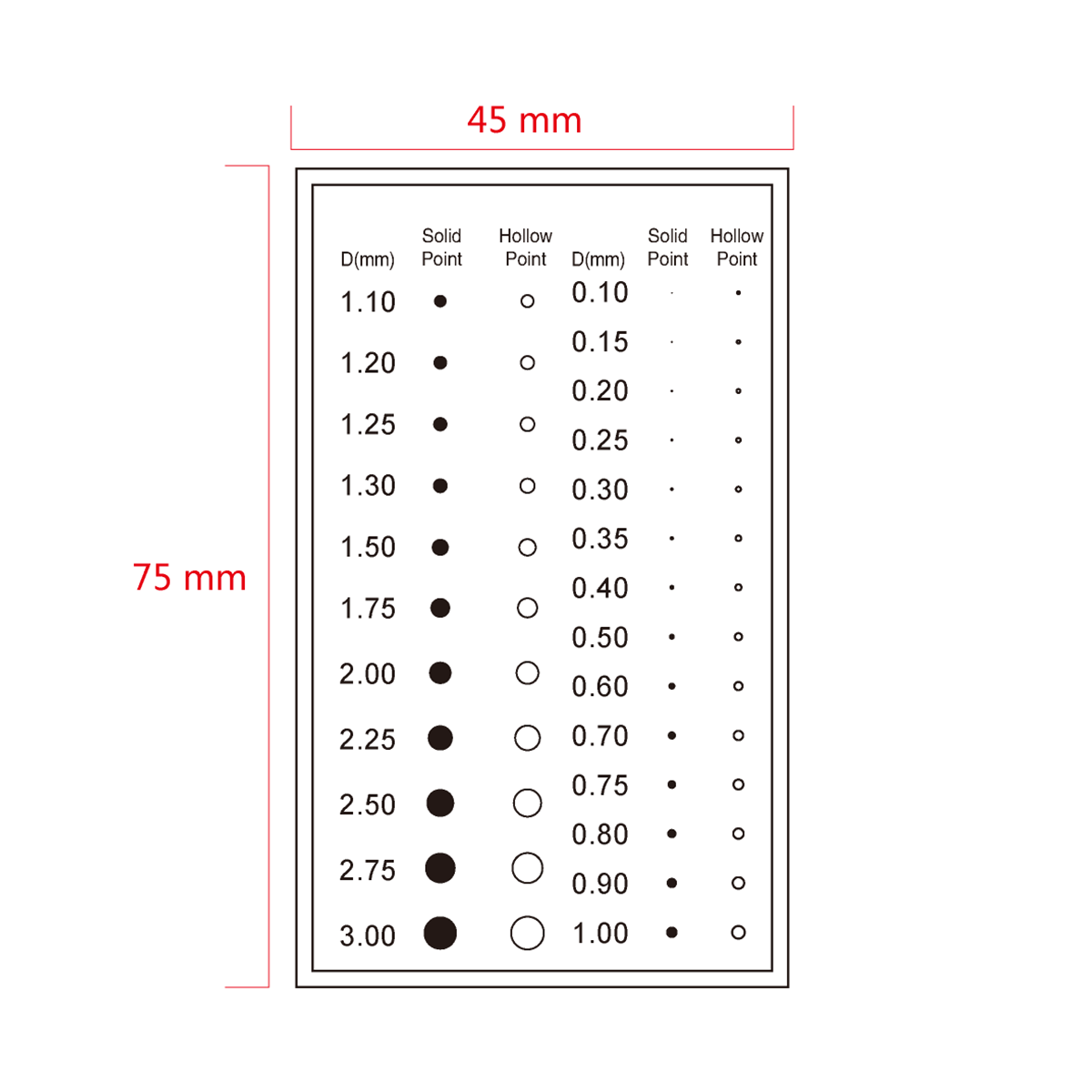 Multi-Function Film Ruler . Film Ruler Dimensions: 75x45x0.1mm. Diameters Range: Dia. 0.1-3.0mm.