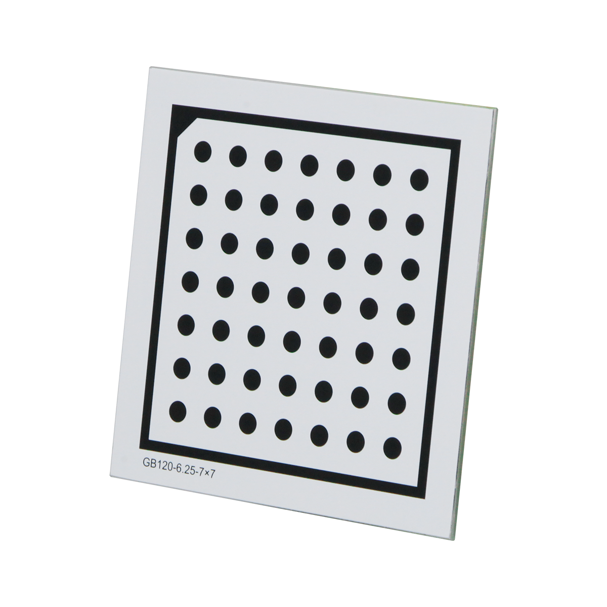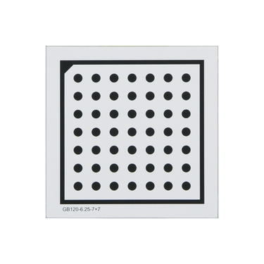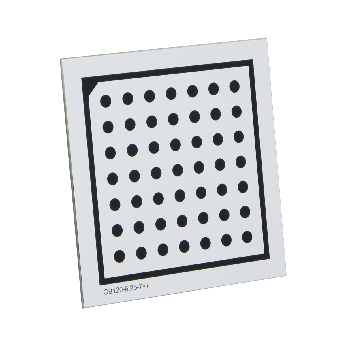 120x120mm. Effective Area: 100x100mm. Marker Spacing: 12.5mm. Dot Diameter: Dia. 6.25mm. Array Specification: 7x7. Substrate Material: Green Float Glass. Panel Material: Alumina. Manufacturing Precision: ±10μm.