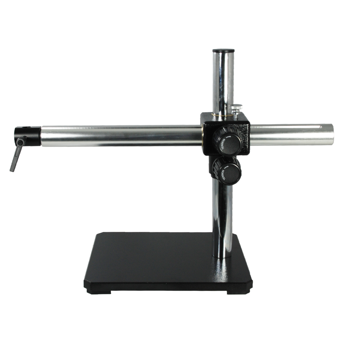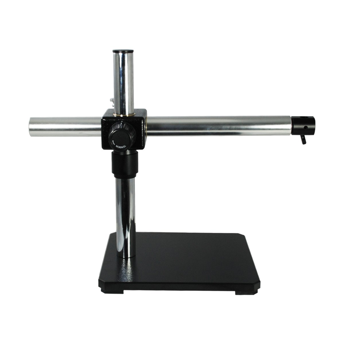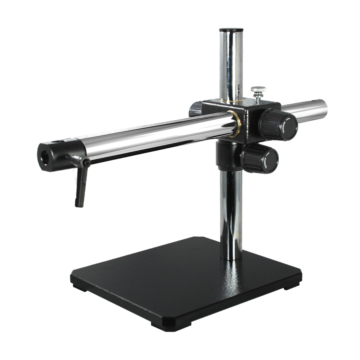 Boom stand is also called universal stand. It is a relatively large pole type stand. The height and length of the stand are big, and it can be freely adjusted in height, length and various angles. Its large weight ensures stable support and occupation of large space, but it can make the microscope free to move in a wide range with convenience. Boom stand is suitable for observing large objects. The direction of boom stand is flexible, and when in use, various kinds of positions and methods can be adopted, such as front, side, and tilt etc., to facilitate the layout of the workbench. On the side of the crossbar of the boom stand, a 5/8-inch connecting hole is generally left for connecting various focusing mechanisms and microscopes. The base of the boom stand usually only plays a fixing and supporting role. Under the observation of the microscope, it is an empty workbench, which can be used to place various platforms, work operating surfaces, and tools, etc., and can be freely combined into different working positions. When the base is large, the object to be observed can also be placed. In industrial places, most of the working positions are fixed. Sometimes, in one working position, a lot of tools, equipment and instruments need to be placed.. Because the microscope is relatively large in size and takes up also a relatively bigger space, and not convenient to move back and forth, therefore for purpose of use, the boom stand can be placed in an appropriate position, and does not need to occupy the most commonly used work tables. When in use, the microscope can be moved over, and pushed to the side when not in use. This is very suitable for use in electronics factories, installation and maintenance, medical and animal anatomy, archaeology and other industries. Boom stand generally does not have a fixed focusing device, and you can choose a variety of flexible accessories. Because the stand needs to ensure flexibility, therefore there are many locking buttons in all directions. In any time after adjustment, it must be ensured that each knob is in a locked state to avoid sliding, tilting and flipping of the microscope, thereby damaging the microscope and the items on the workbench. |