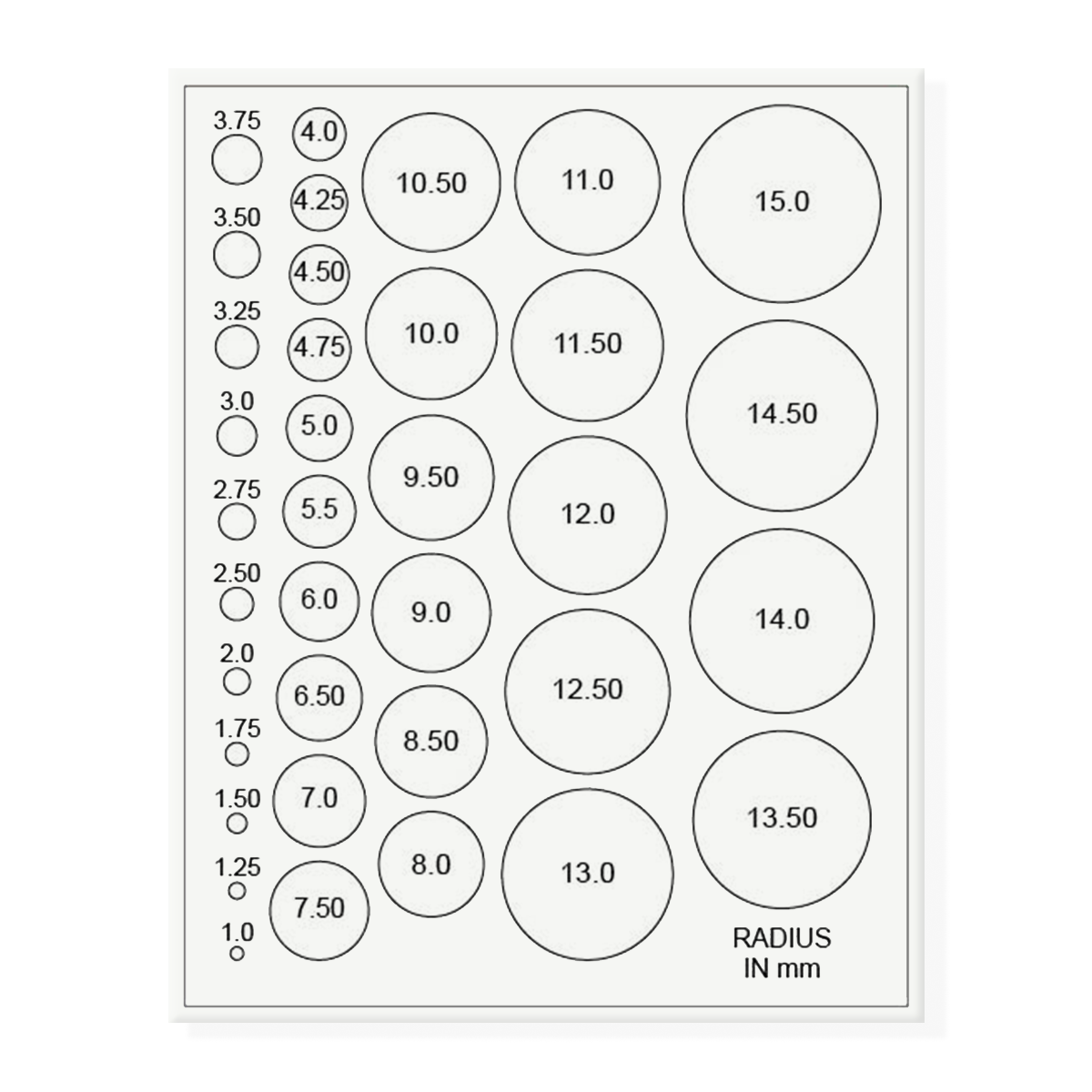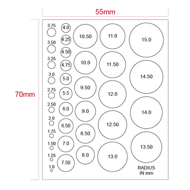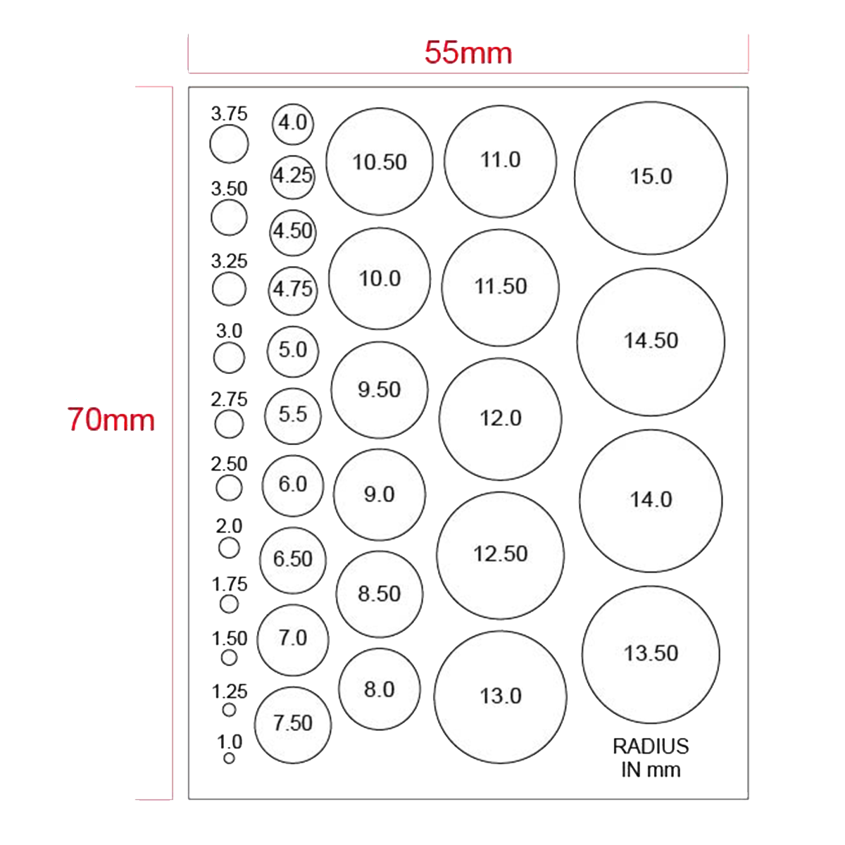 Multi-Function Film Ruler . Film Ruler Dimensions: 70x55x0.1mm. Diameters Range: Dia. 2-27mm.